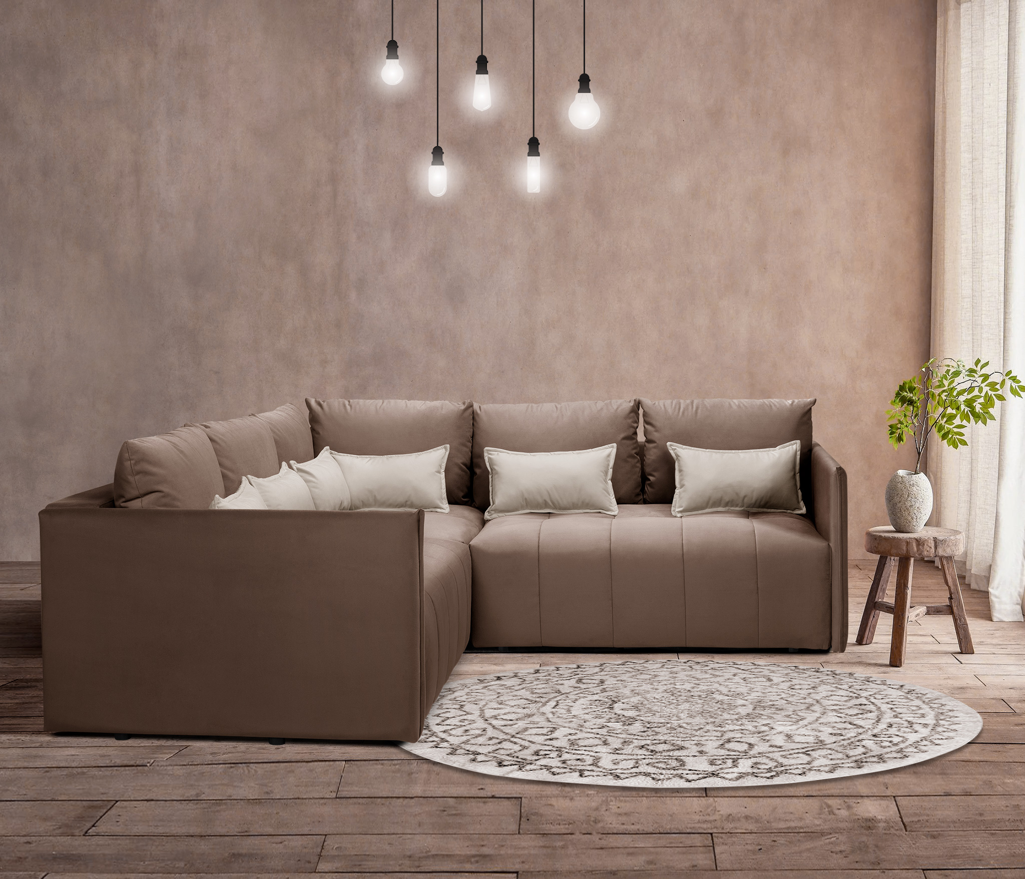 В конструкцию кроме дивана могут включаться пуфы, кресла, оттоманки, тумбы, столики, комплектация у разных производителей отличается.