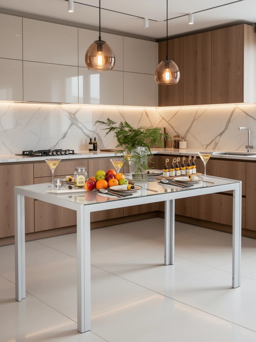 Стеклянная поверхность не боится горячего, легко очищается и сохраняет прозрачность даже при активной эксплуатации. Такие столы универсальны, эстетичны и подходят как для маленьких кухонь, так и для просторных гостиных.