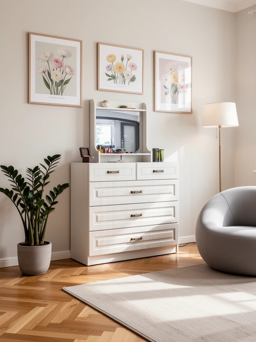 Учитывайте высоту потолков, площадь комнаты и объем хранения. Для малогабаритных помещений лучше покупать узкие модели (глубина 40-50 см). Измерьте пространство, чтобы верхние ящики были доступны без табуретки, а мебель не закрывала розетки.