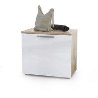 Все элементы мебели гармонично дополняют друг друга, составляя простой и практичный комплект мебели. За распашной дверки тумбы расположена одна полочка. Размеры позволяют хранить до 4-х пар невысокой обуви. Удобная высота тумбы, 50 см., позволяет использовать её в качестве подставки для сумок или банкетки для переобувания. Дверка тумбы универсальна и может открываться на любую сторону, что необходимо определить при первой сборке модуля. Открытая вешалка позволяет одежде лучше проветриться, быстрее просохнуть и сохранить форму. Вешалка выполнена в виде настенной панели, имеет антресольную полочку для головных уборов, закреплённую на металлическом полкодержателе. Форма полкодержателя выполнена так, что может использоваться в качестве штанги для развешивания одежды на плечиках. На лицевой панели предусмотрена пара крючков для размещения сумочек или зонтиков. Выполнена мебель в сочетании светлого цвета натурального дуба корпуса из ламинированной ДСП 16 мм, и глянцевых искристо белых МДФ фасадов. Линейная фрезеровка фасадов и периферическая фрезеровка по типу фацета украшают мебель и определяют название коллекции. Фасады закреплены на четырёхшарнирных петлях, выдвижные ящики мебели закреплены на шариковых направляющих полного выдвижения. Установлена на пластиковые опоры высотой 20 мм. Поставляется в разобранном виде, надёжно упакованными, с комплектом фурнитуры и инструкцией по сборке. Тумба для обуви с вешалками для верхней одежды Лайн - комплект мебели, состоящий из элементов коллекции для прихожих Лайн.