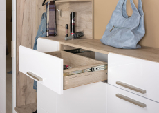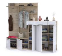 Данная комплектация представлена набором модулей коллекции Лайн, и состоит из тумбы, открытой вешалки, комода и мини-прихожей. Глубина модулей всего 35 см., что позволяет использовать мебель в весьма узких помещениях. Открытая вешалка Лайн 15.03 позволяет одежде лучше проветриться, быстрее просохнуть и сохранить форму. Вешалка выполнена в виде настенной панели, имеет антресольную полочку для головных уборов, закреплённую на металлическом полкодержателе. Форма полкодержателя выполнена так, что может использоваться в качестве штанги для развешивания одежды на плечиках. На лицевой панели предусмотрена пара крючков для размещения сумочек или зонтиков. За распашной дверки тумбы Лайн 13.234 расположена одна полочка. Размеры позволяют хранить до 4-х пар невысокой обуви. Удобная высота тумбы, 50 см., позволяет использовать её в качестве подставки для сумок или банкетки для переобувания. Комод Лайн 13.121 располагает двумя выдвижными ящиками и двумя распашными дверками с парой полочек за каждой. Мини-прихожая Лайн 10.16 представляет собой панель, комбинирующую открытую вешалку и две распашные тумбы с внутренними полками. Вешалка имеет антресольную полочку для головных уборов, которая закреплена на металлическом полкодержателе, что может использоваться в качестве штанги для развешивания одежды на плечиках. На лицевой панели предусмотрена пара крючков для размещения сумочек или зонтиков и полочка для мелочей. Высокая тумба с ящиком и двумя полками расположена с правой стороны прихожей, низкая с полкой - с левой. Универсальной сборки нет. Все элементы мебели могут быть расположены в любом порядке друг относительно друга, составляя гармоничный комплект для обустройства прихожей. Выполнена мебель в сочетании светлого цвета натурального дуба корпуса из ламинированной ДСП 16 мм, и глянцевых искристо белых МДФ фасадов. Линейная фрезеровка фасадов и периферическая фрезеровка по типу фацета украшают мебель и определяют название коллекции. Фасады закреплены на четырёхшарнирных петлях, выдвижные ящики мебели закреплены на шариковых направляющих полного выдвижения. Установлена на пластиковые опоры высотой 20 мм. Поставляется в разобранном виде, надёжно упакованными, с комплектом фурнитуры и инструкцией по сборке.