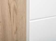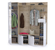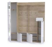 Данная комплектация представлена набором модулей коллекции Лайн, и состоит из шкафа, тумбы, открытой вешалки и мини-прихожей. Глубина модулей всего 35 см., что позволяет использовать мебель в весьма узких помещениях. Шкаф для одежды Лайн 08.122 располагает выдвижной штангой для одежды на вешалках и две полочки. Имеет универсальную сборку. Открытая вешалка Лайн 15.03 позволяет одежде лучше проветриться, быстрее просохнуть и сохранить форму. Вешалка выполнена в виде настенной панели, имеет антресольную полочку для головных уборов, закреплённую на металлическом полкодержателе. Форма полкодержателя выполнена так, что может использоваться в качестве штанги для развешивания одежды на плечиках. На лицевой панели предусмотрена пара крючков для размещения сумочек или зонтиков. За распашной дверки тумбы Лайн 13.234 расположена одна полочка. Размеры позволяют хранить до 4-х пар невысокой обуви. Удобная высота тумбы, 50 см., позволяет использовать её в качестве подставки для сумок или банкетки для переобувания. Мини-прихожая Лайн 10.16 представляет собой панель, комбинирующую открытую вешалку и две распашные тумбы с внутренними полками. Вешалка имеет антресольную полочку для головных уборов, которая закреплена на металлическом полкодержателе, что может использоваться в качестве штанги для развешивания одежды на плечиках. На лицевой панели предусмотрена пара крючков для размещения сумочек или зонтиков и полочка для мелочей. Высокая тумба с ящиком и двумя полками расположена с правой стороны прихожей, низкая с полкой - с левой. Универсальной сборки нет. Все элементы мебели могут быть расположены в любом порядке друг относительно друга, составляя гармоничный комплект для обустройства прихожей. Зеркало с фацетом на фасаде шкафа подчёркивают нарядный вид прихожей, а пластиковая ручка цвета сатин созвучны линиям фрезеровки. Выполнена мебель в сочетании светлого цвета натурального дуба корпуса из ламинированной ДСП 16 мм, и глянцевых искристо белых МДФ фасадов. Линейная фрезеровка фасадов и периферическая фрезеровка по типу фацета украшают мебель и определяют название коллекции. Фасады закреплены на четырёхшарнирных петлях, выдвижные ящики мебели закреплены на шариковых направляющих полного выдвижения. Установлена на пластиковые опоры высотой 20 мм. Поставляется в разобранном виде, надёжно упакованными, с комплектом фурнитуры и инструкцией по сборке.