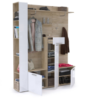 Данная комплектация представлена набором модулей коллекции Лайн, и состоит из стеллажа, тумбы, открытой вешалки и мини-прихожей. Глубина модулей всего 35 см., что позволяет использовать мебель в весьма узких помещениях. Стеллаж Лайн 10.141 располагает четырьмя открытыми полочками, на которых достаточно места для необходимых под рукой мелочей и предметов декора. Модель имеет универсальную сборку, используется как торцевой элемент мебельной композиции и может быть расположен с любой стороны. Открытая вешалка Лайн 15.03 позволяет одежде лучше проветриться, быстрее просохнуть и сохранить форму. Вешалка выполнена в виде настенной панели, имеет антресольную полочку для головных уборов, закреплённую на металлическом полкодержателе. Форма полкодержателя выполнена так, что может использоваться в качестве штанги для развешивания одежды на плечиках. На лицевой панели предусмотрена пара крючков для размещения сумочек или зонтиков. За распашной дверки тумбы Лайн 13.234 расположена одна полочка. Размеры позволяют хранить до 4-х пар невысокой обуви. Удобная высота тумбы, 50 см., позволяет использовать её в качестве подставки для сумок или банкетки для переобувания. Мини-прихожая Лайн 10.16 представляет собой панель, комбинирующую открытую вешалку и две распашные тумбы с внутренними полками. Вешалка имеет антресольную полочку для головных уборов, которая закреплена на металлическом полкодержателе, что может использоваться в качестве штанги для развешивания одежды на плечиках. На лицевой панели предусмотрена пара крючков для размещения сумочек или зонтиков и полочка для мелочей. Высокая тумба с ящиком и двумя полками расположена с правой стороны прихожей, низкая с полкой - с левой. Универсальной сборки нет. Все элементы мебели могут быть расположены в любом порядке друг относительно друга, составляя гармоничный комплект для обустройства прихожей. Выполнена мебель в сочетании светлого цвета натурального дуба корпуса из ламинированной ДСП 16 мм, и глянцевых искристо белых МДФ фасадов. Линейная фрезеровка фасадов и периферическая фрезеровка по типу фацета украшают мебель и определяют название коллекции. Фасады закреплены на четырёхшарнирных петлях, выдвижные ящики мебели закреплены на шариковых направляющих полного выдвижения. Установлена на пластиковые опоры высотой 20 мм. Поставляется в разобранном виде, надёжно упакованными, с комплектом фурнитуры и инструкцией по сборке.