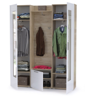 Данная комплектация представлена набором модулей коллекции Лайн, и состоит из двух одинаковых шкафов и тумбы с вешалкой. Глубина модулей всего 35 см., что позволяет использовать мебель в весьма узких помещениях. Шкаф для одежды Лайн 08.122 располагает выдвижной штангой для одежды на вешалках и две полочки. Имеет универсальную сборку. Данная комплектация включает два одинаковых шкафа, что увеличивает функциональность прихожей. Открытая вешалка Лайн 15.03 позволяет одежде лучше проветриться, быстрее просохнуть и сохранить форму. Вешалка выполнена в виде настенной панели, имеет антресольную полочку для головных уборов, закреплённую на металлическом полкодержателе. Форма полкодержателя выполнена так, что может использоваться в качестве штанги для развешивания одежды на плечиках. На лицевой панели предусмотрена пара крючков для размещения сумочек или зонтиков. За распашной дверки тумбы Лайн 13.234 расположена одна полочка. Размеры позволяют хранить до 4-х пар невысокой обуви. Удобная высота тумбы, 50 см., позволяет использовать её в качестве подставки для сумок или банкетки для переобувания. Все элементы мебели могут быть расположены в любом порядке друг относительно друга, составляя гармоничный комплект для обустройства прихожей. Зеркало с фацетом на фасаде шкафа подчёркивают нарядный вид прихожей, а пластиковая ручка цвета сатин созвучны линиям фрезеровки. Выполнена мебель в сочетании светлого цвета натурального дуба корпуса из ламинированной ДСП 16 мм, и глянцевых искристо белых МДФ фасадов. Линейная фрезеровка фасадов и периферическая фрезеровка по типу фацета украшают мебель и определяют название коллекции. Фасады закреплены на четырёхшарнирных петлях, выдвижные ящики мебели закреплены на шариковых направляющих полного выдвижения. Установлена на пластиковые опоры высотой 20 мм. Поставляется в разобранном виде, надёжно упакованными, с комплектом фурнитуры и инструкцией по сборке.