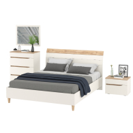 В этот комплект входит двуспальная кровать Муссон 11.41, прикроватная тумбочка Муссон 16.03, шкаф двухстворчатый Муссон 13.198 со стеллажом Муссон 13.349 и туалетный столик Бостон 12.69 с навесным зеркалом. Выбирая двуспальную кровать Муссон Муссон 11.41 - Вы выбираете крепкий сон и уют. Двухспальная кровать с жестким изголовьем со спальным местом 1600х2000 мм подарит возможность отдыхать в нескончаемом комфорте. Планкованное изголовье с изгибом — два варианта конфигурации - с полкой и без неё. Кровать оснащена ортопедическим основанием с ламелям для матраса 1600х2000 мм. Максимальная нагрузка на каждое спальное место 100 кг, общая - 200 кг. Матрас для этой модели кровати приобретаются отдельно. Рекомендованная высота матраса от 180 мм. По центру основания имеется металлическая, изножье оснащено деревянными опорами. Комбинация сочетания исполнения с нежными цветовыми акцентами придает кровати выразительную элегантность.