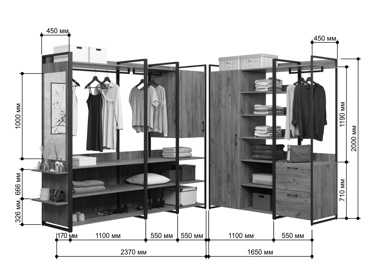 Набор Urban 03 включает в себя два стеллажа с штангой для вешалок и полками, стеллаж с штангой и двумя выдвижными ящиками, одностворчатый распашной шкаф со стеллажом, стеллаж с полками и распашной дверцей и навесной модуль с зеркалом и полками. Каркас выполнен из металлического профиля 20х20 мм покрашенного порошковой краской, корпус и фасады из ЛДСП 16 мм. Каждый модуль имеет пластиковые ножки регулируемые по высоте. Все изделия серии Urban Лофт отлично комбинируются друг с другом и идеально подойдут для гардеробной, прихожей или офиса.