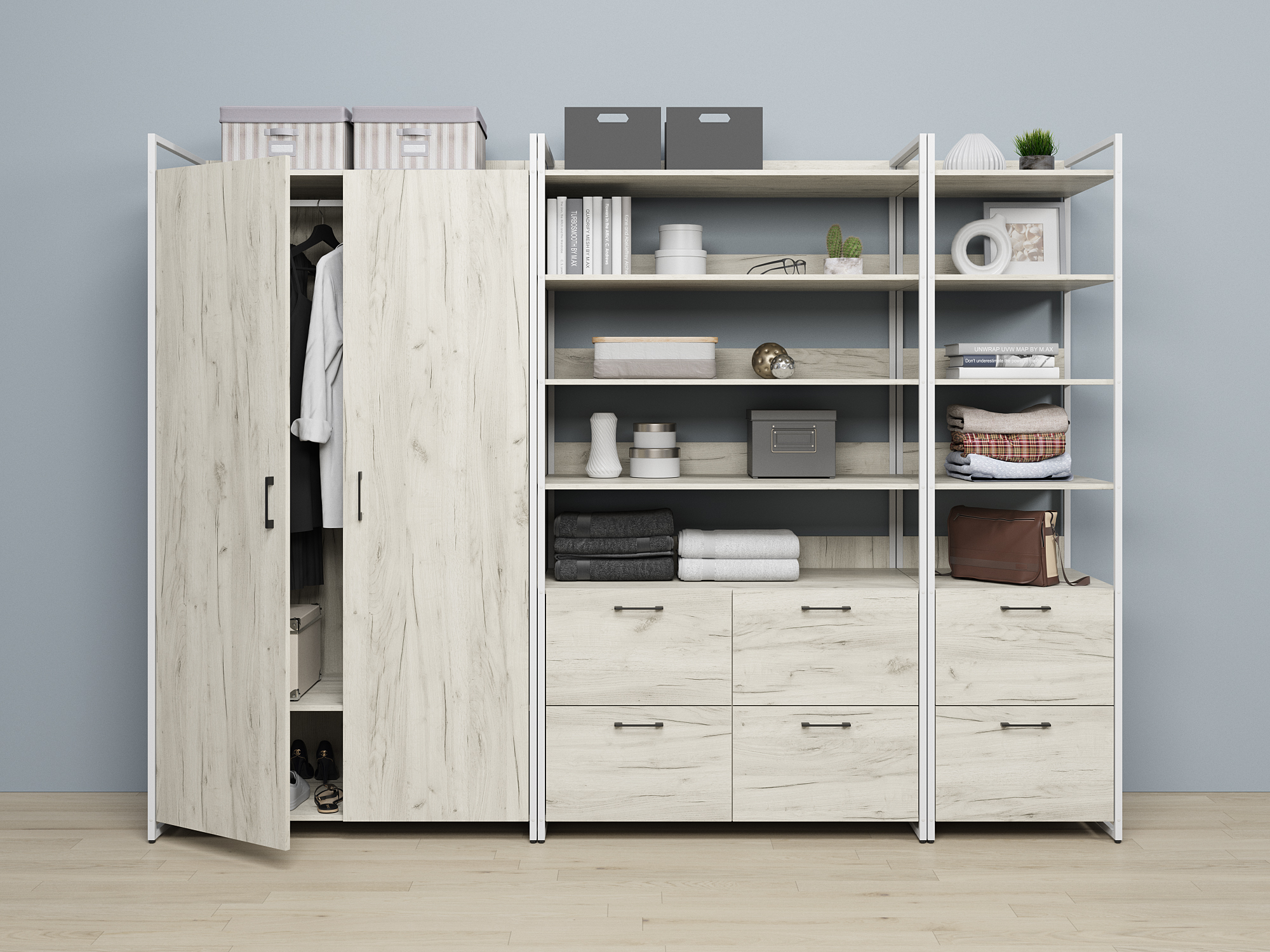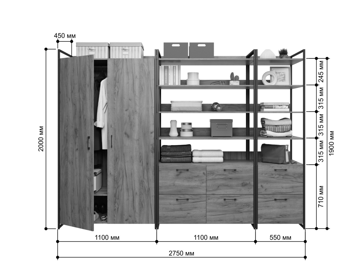Набор Urban 01 включает в себя два стеллажа с полками и выдвижными ящиками для хранения и распашной двустворчатый шкаф с полкой и вешалкой для длинной одежды. Каркас выполнен из металлического профиля 20х20 мм покрашенного порошковой краской, корпус и фасады из ЛДСП 16 мм. Каждый модуль имеет пластиковые ножки регулируемые по высоте. Все изделия серии Urban Лофт отлично комбинируются друг с другом и идеально подойдут для гардеробной, прихожей или офиса.