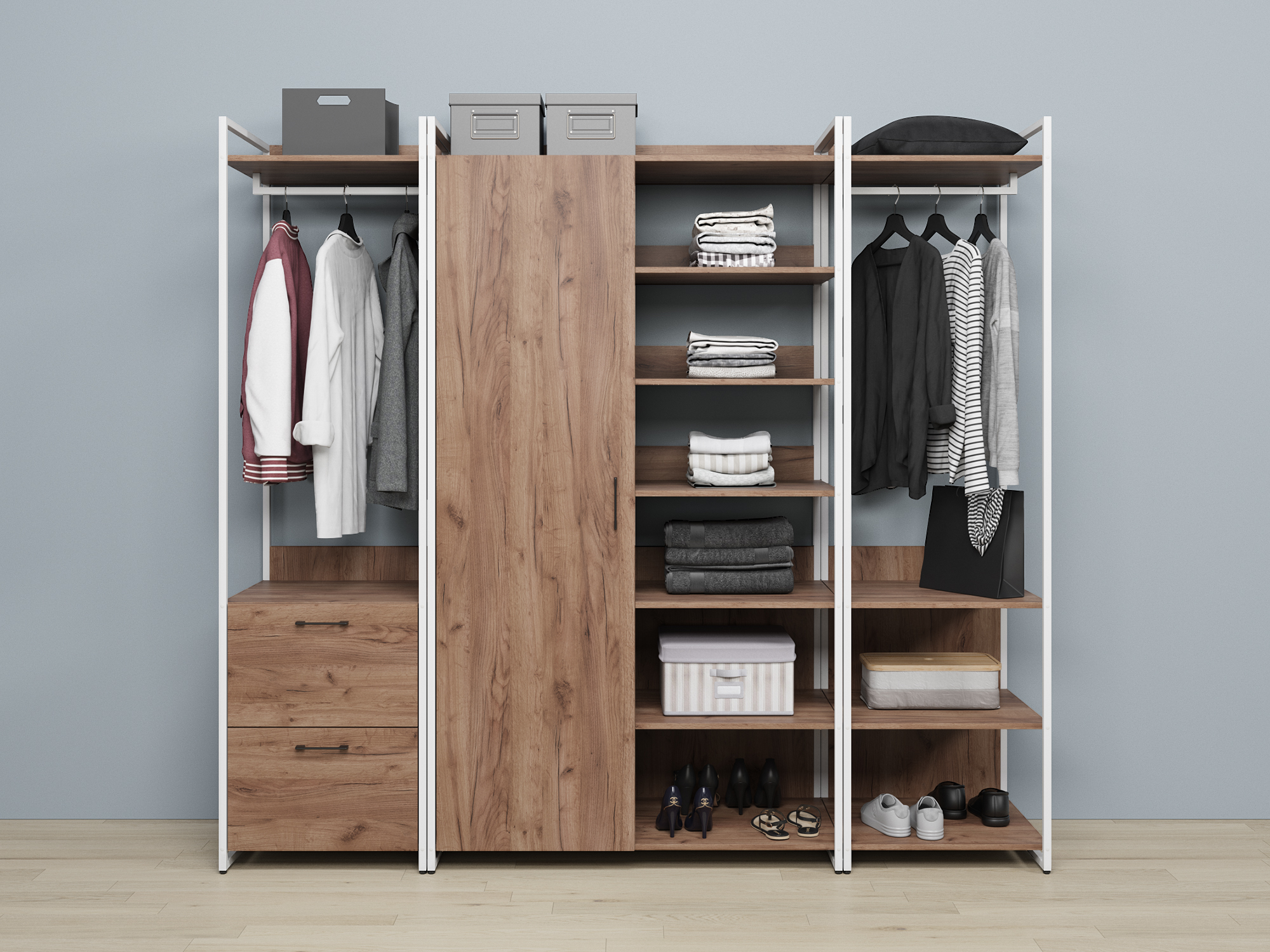 Набор Urban 02 включает в себя стеллаж с штангой для вешалок и двумя выдвижными ящиками, стеллаж с штангой и полками и одностворчатый распашной шкаф со стеллажом. Каркас выполнен из металлического профиля 20х20 мм покрашенного порошковой краской, корпус и фасады из ЛДСП 16 мм. Каждый модуль имеет пластиковые ножки регулируемые по высоте. Все изделия серии Urban Лофт отлично комбинируются друг с другом и идеально подойдут для гардеробной, прихожей или офиса.