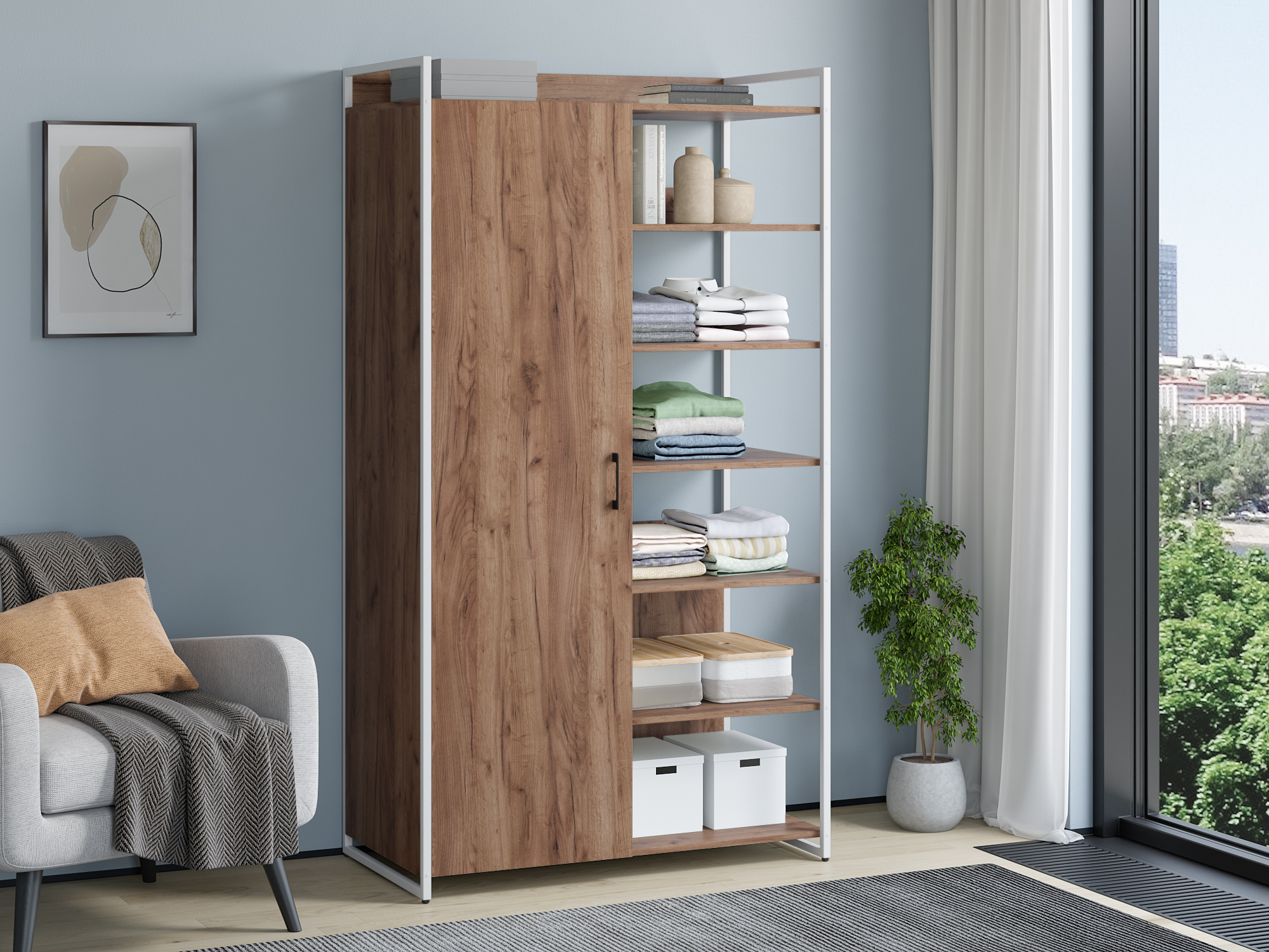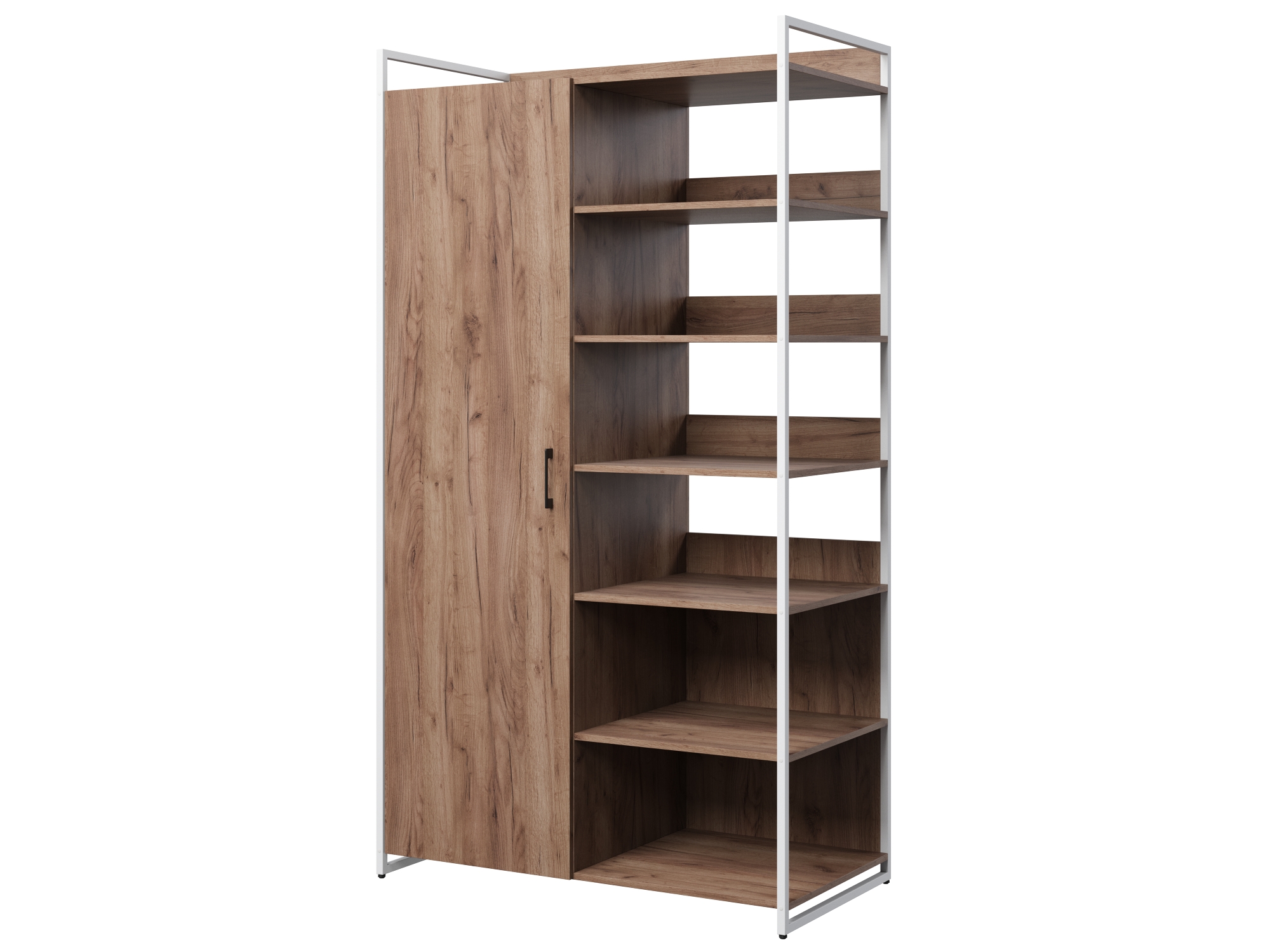 Шкаф из серии Urban Лофт для хранения верхней одежды и стеллажом. Включает в себя штангу для вешалок, две полки и открытый стеллаж с семью полками . Каркас выполнен из металлического профиля 20х20 мм, покрашенного порошковой краской. корпус из двери из ЛДСП 16 мм. Все изделия серии Urban Лофт отлично комбинируются друг с другом и идеально подойдут для гардеробной, прихожей или офиса.
