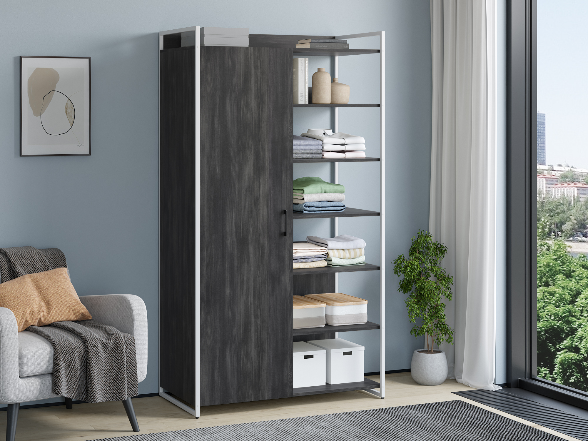 Шкаф из серии Urban Лофт для хранения верхней одежды и стеллажом. Включает в себя штангу для вешалок, две полки и открытый стеллаж с семью полками . Каркас выполнен из металлического профиля 20х20 мм, покрашенного порошковой краской. корпус из двери из ЛДСП 16 мм. Все изделия серии Urban Лофт отлично комбинируются друг с другом и идеально подойдут для гардеробной, прихожей или офиса.
