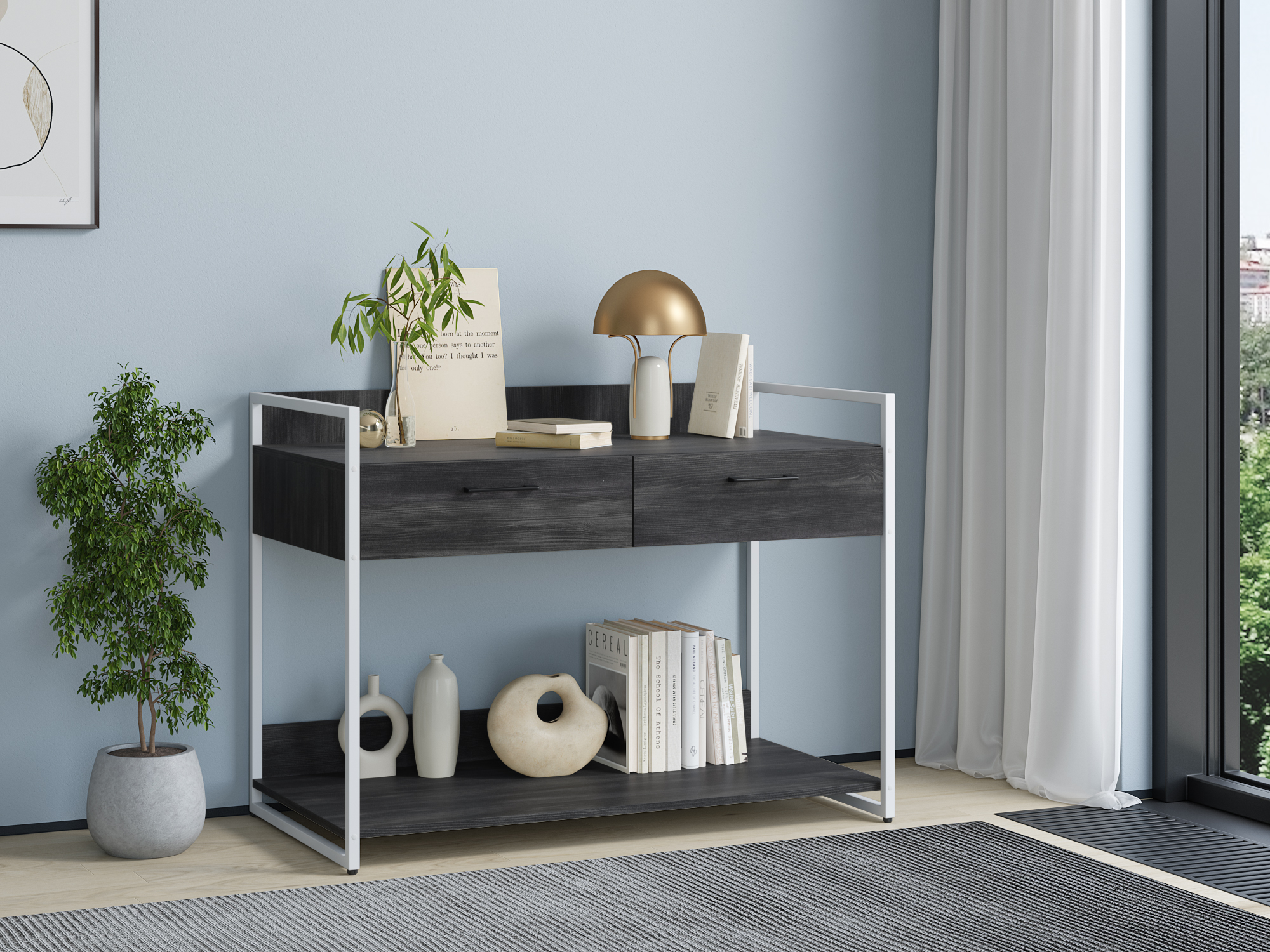 Консоль из серии Urban Лофт. Модель имеет два выдвижных ящика на направляющих и просторную нишу для хранения вещей. Каркас выполнен из металлического профиля 20х20 мм, покрашенного порошковой краской. корпус и ящики из ЛДСП 16 мм. Консоль отлично комбинируется с другими моделями из серии Urban.