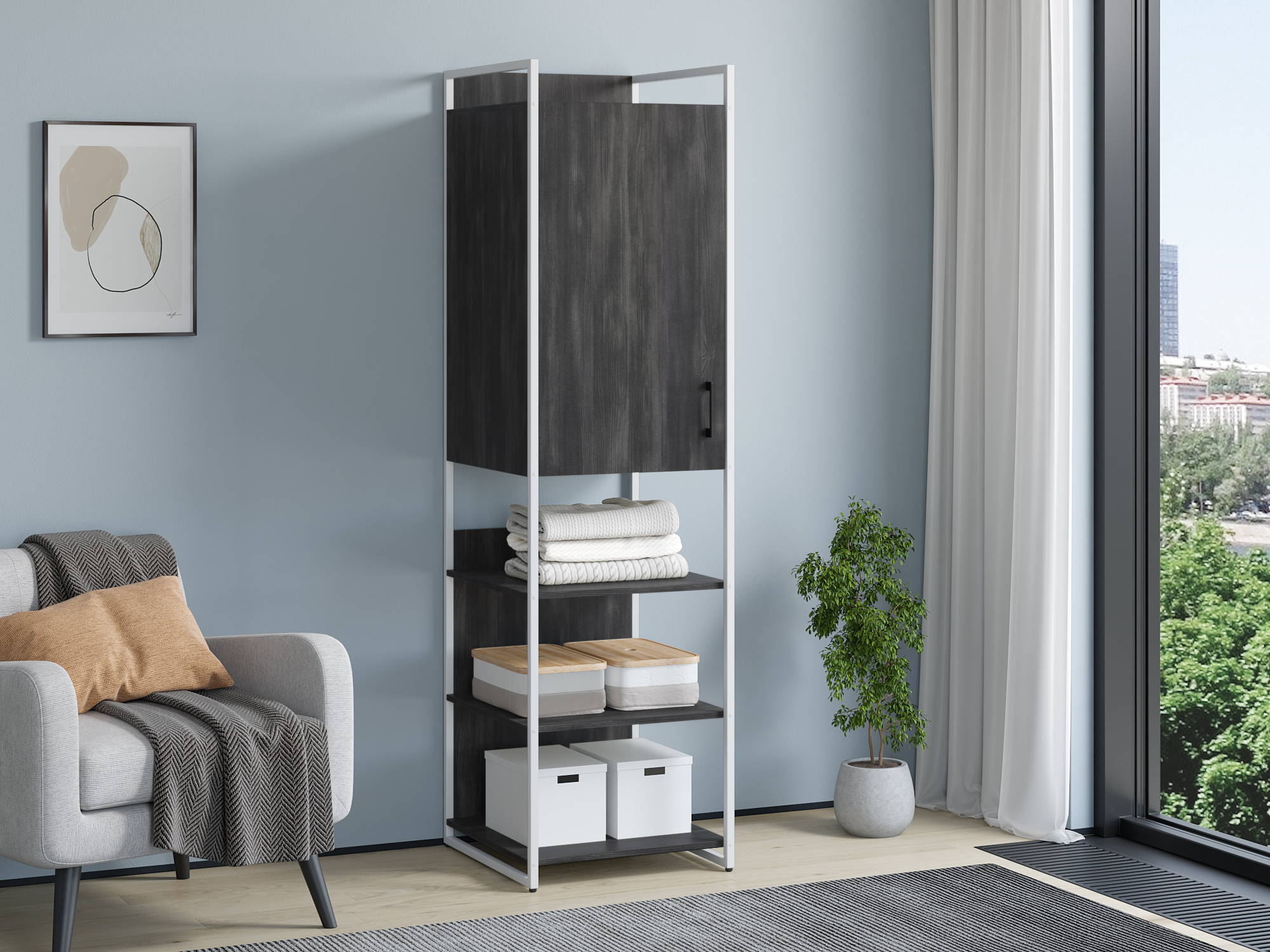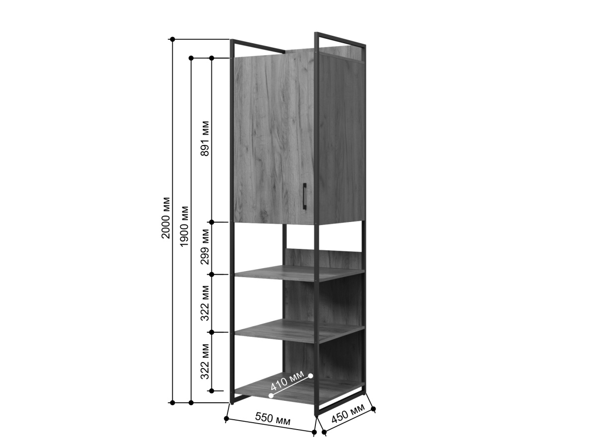 Стеллаж из серии Urban Лофт для хранения. Модель имеет три открытых полки и распашной шкаф. Каркас выполнен из металлического профиля 20х20 мм, покрашенного порошковой краской. корпус и ящики из ЛДСП 16 мм. Стеллаж отлично комбинируется с другими моделями из серии Urban.