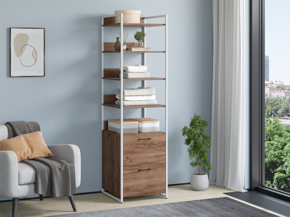 Стеллаж из серии Urban Лофт для хранения. Модель включает в себя пять открытых полок и два ящика на направляющих для хранения вещей. Каркас выполнен из металлического профиля 20х20 мм, покрашенного порошковой краской. корпус и ящики из ЛДСП 16 мм. Стеллаж отлично комбинируется с другими моделями из серии Urban.
