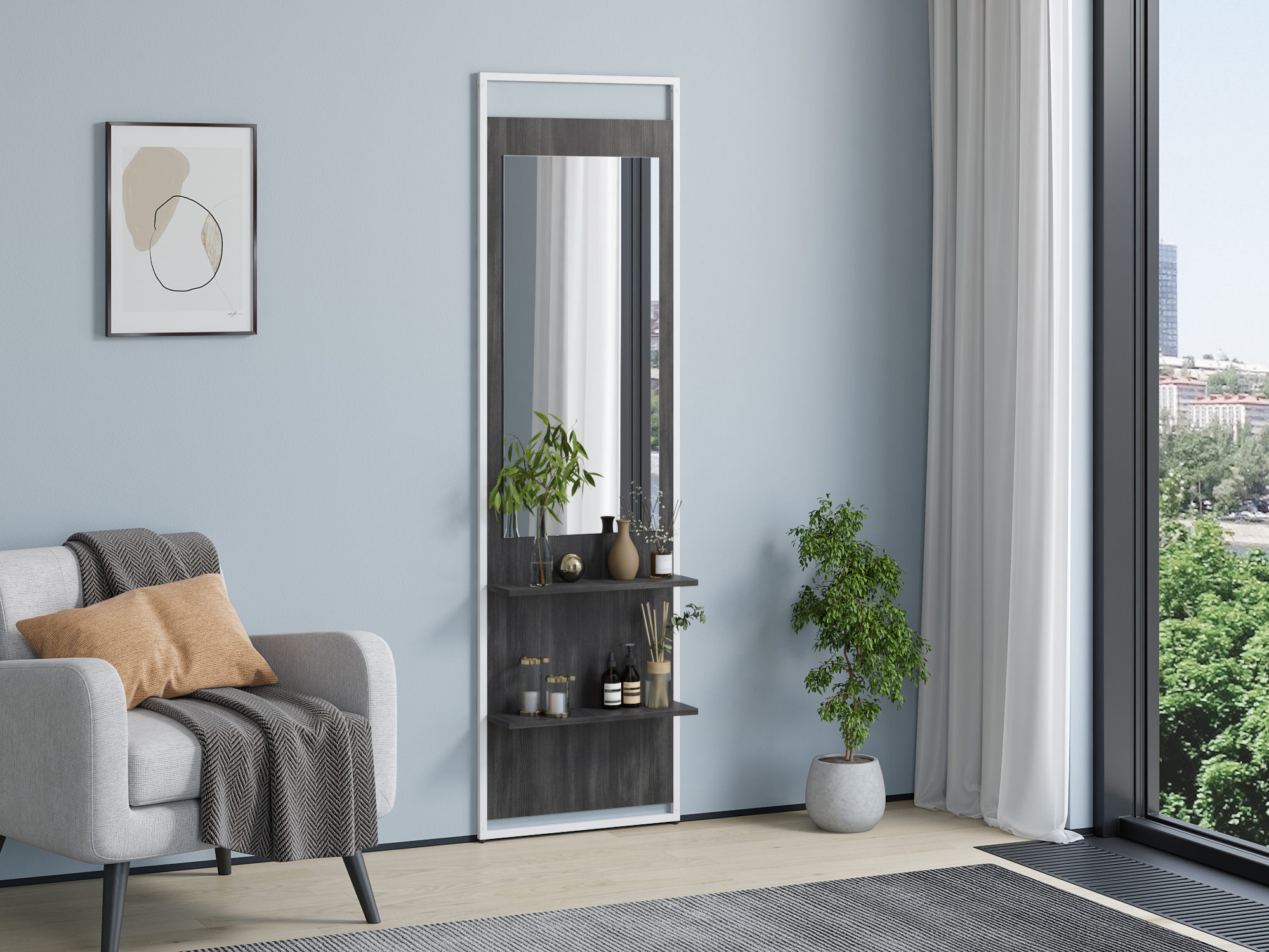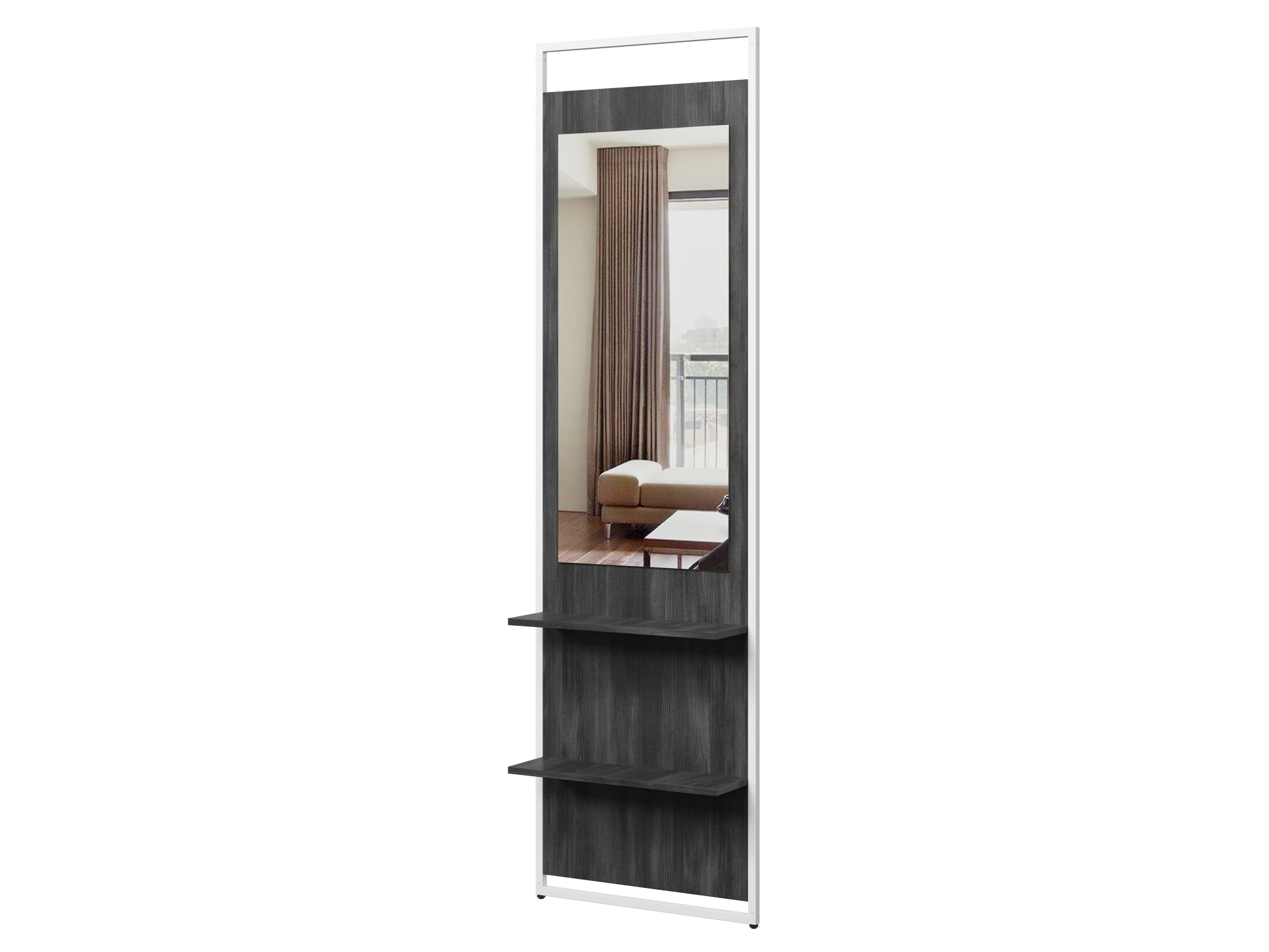 Навесное зеркало с полками для серии Urban Лофт, может быть легко установлено с торцевой части стеллажей или шкафов. Каркас выполнен из металлического профиля 20х20 мм, покрашен порошковой краской. Корпус и полки ЛДСП 16 мм.