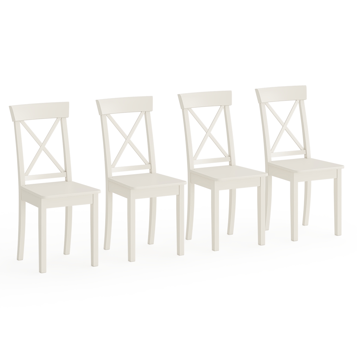 В набор входят 4 стула, которые создадут комфортную и стильную обеденную зону. Эти модели станут удачным выбором и для гостиной или дачного дома. Модель также гармонично впишется в интерьер прихожей или дачного дома. Каркасы стульев, включая спинки, выполнен из массива дерева, окрашенного в цвет слоновой кости. Качественная обработка древесины обеспечивает прочность конструкции и долгий срок службы. Центральная часть спинок оформлена перекрестными планками в виде буквы Х, а широкая горизонтальная перекладина спинки визуально завершает конструкцию и подчёркивает лаконичный силуэт. Сиденья выполнены жёсткими, что делает стулья практичными и универсальными. Жёсткая поверхность удобна в уходе и устойчива к износу.