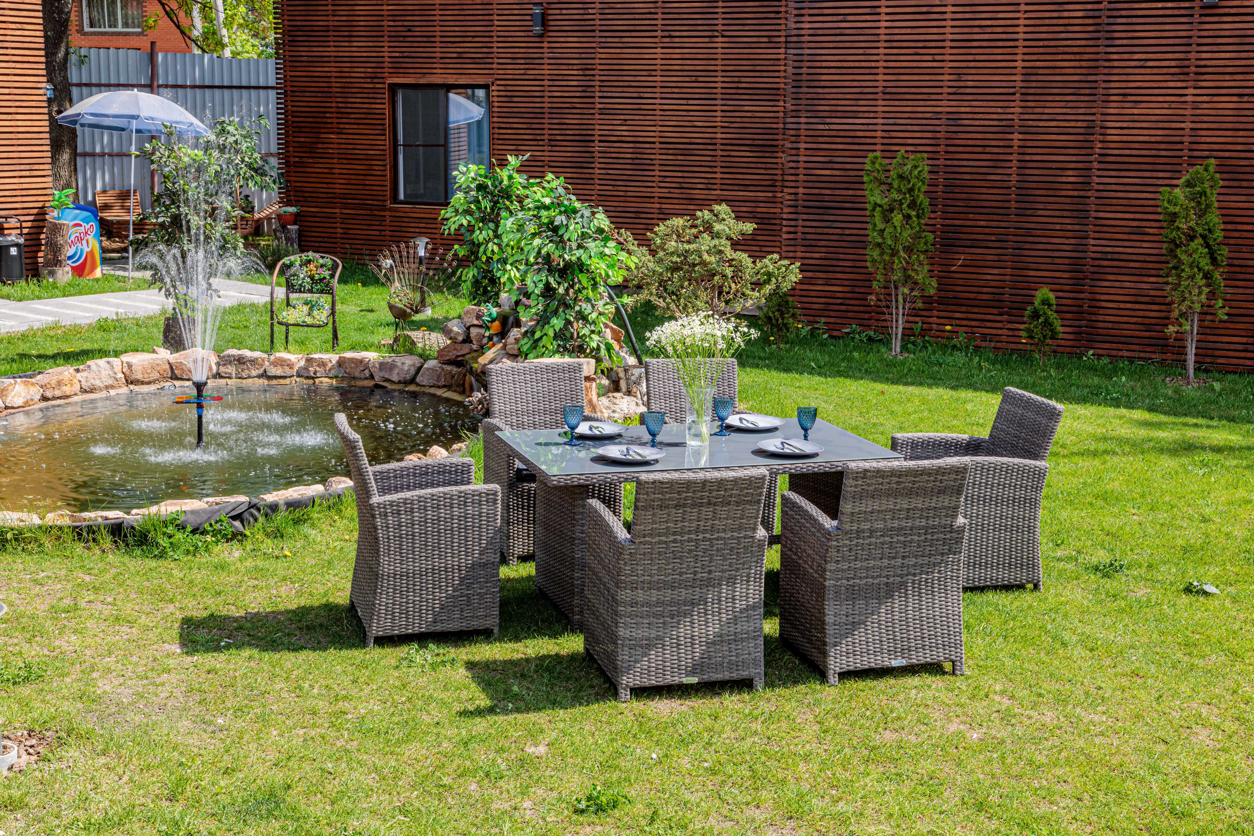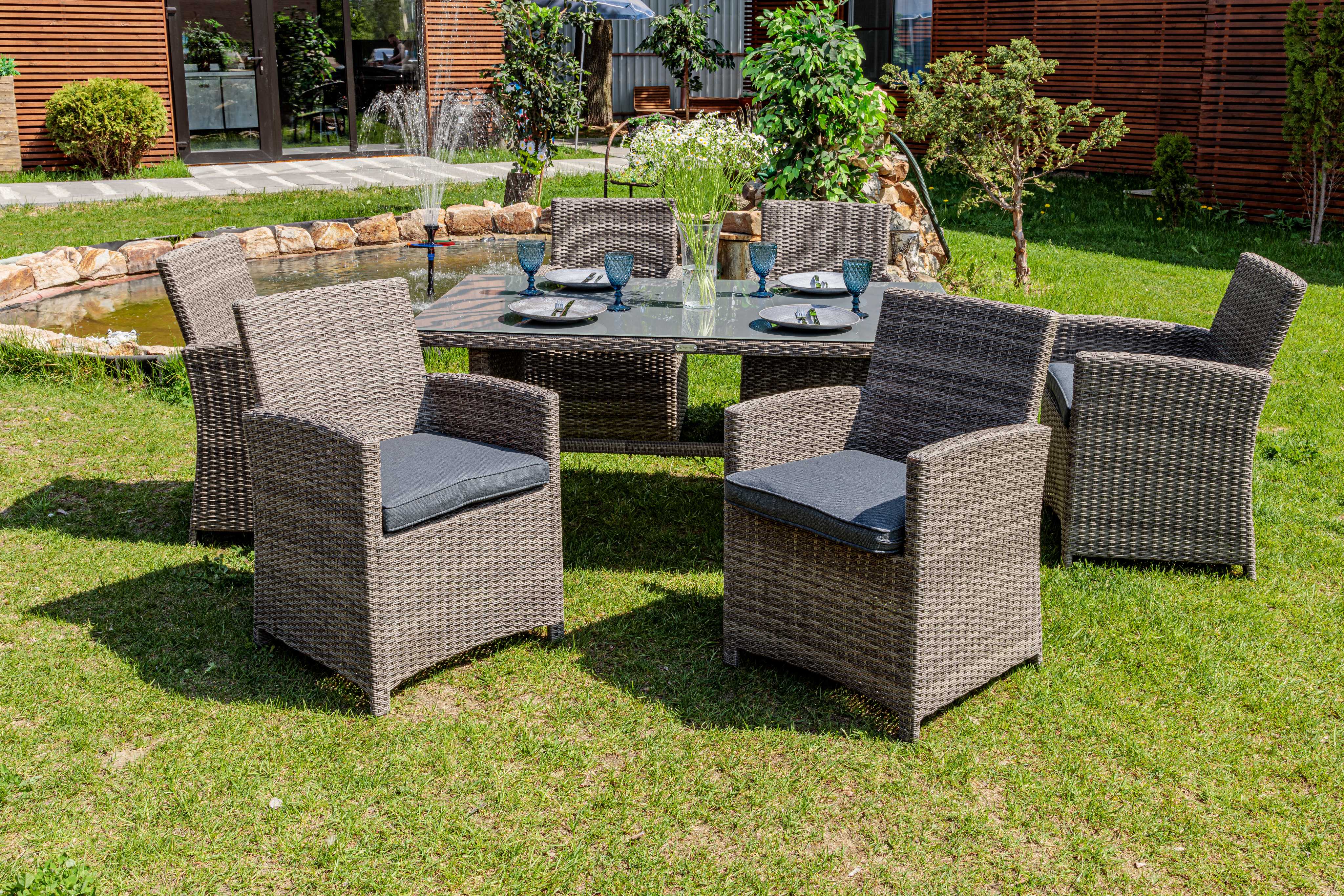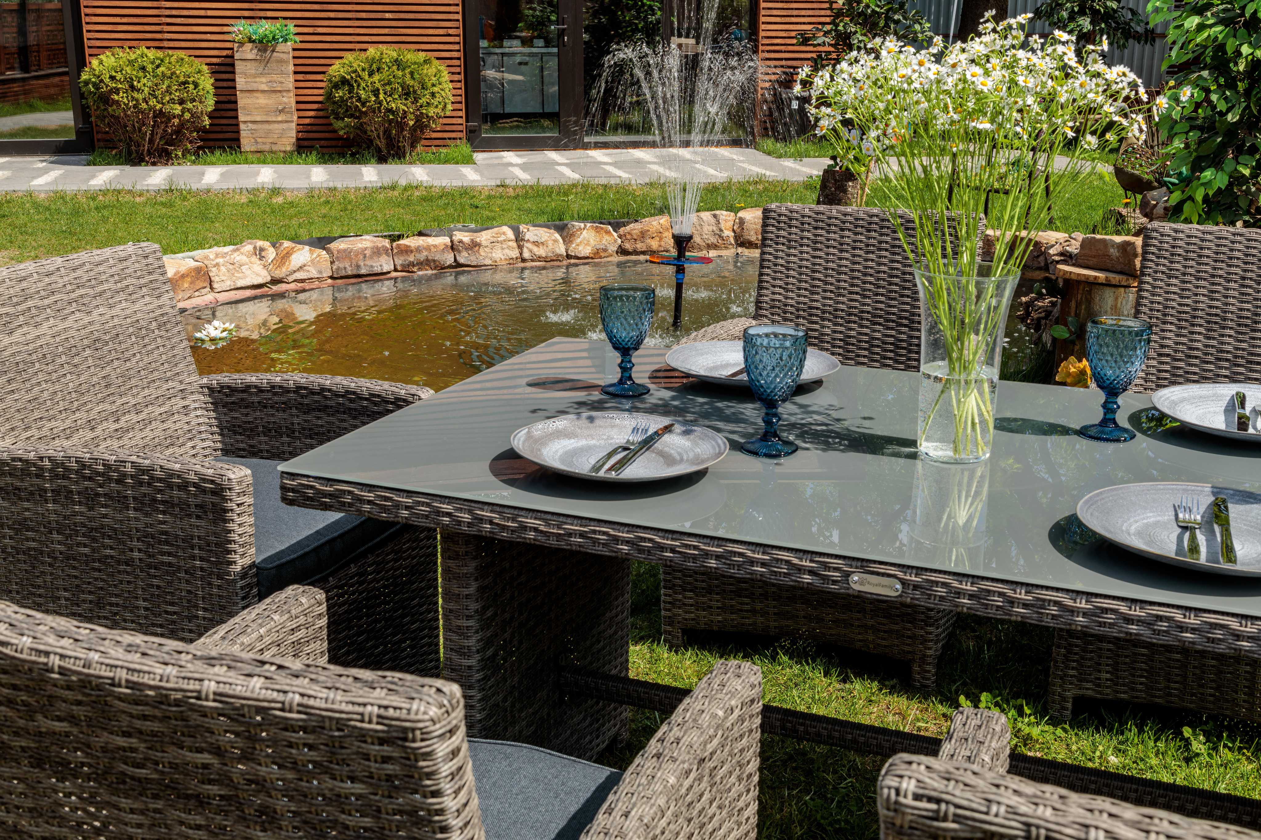 Обеденный комплект FIONA станет отличным решением для тех, кто предпочитает проводить летние вечера на улице в кругу друзей и семьи! Его габаритов вполне достаточно не только для ежедневных семейных трапез на свежем воздухе, но и праздничных застолий в больших компаниях.