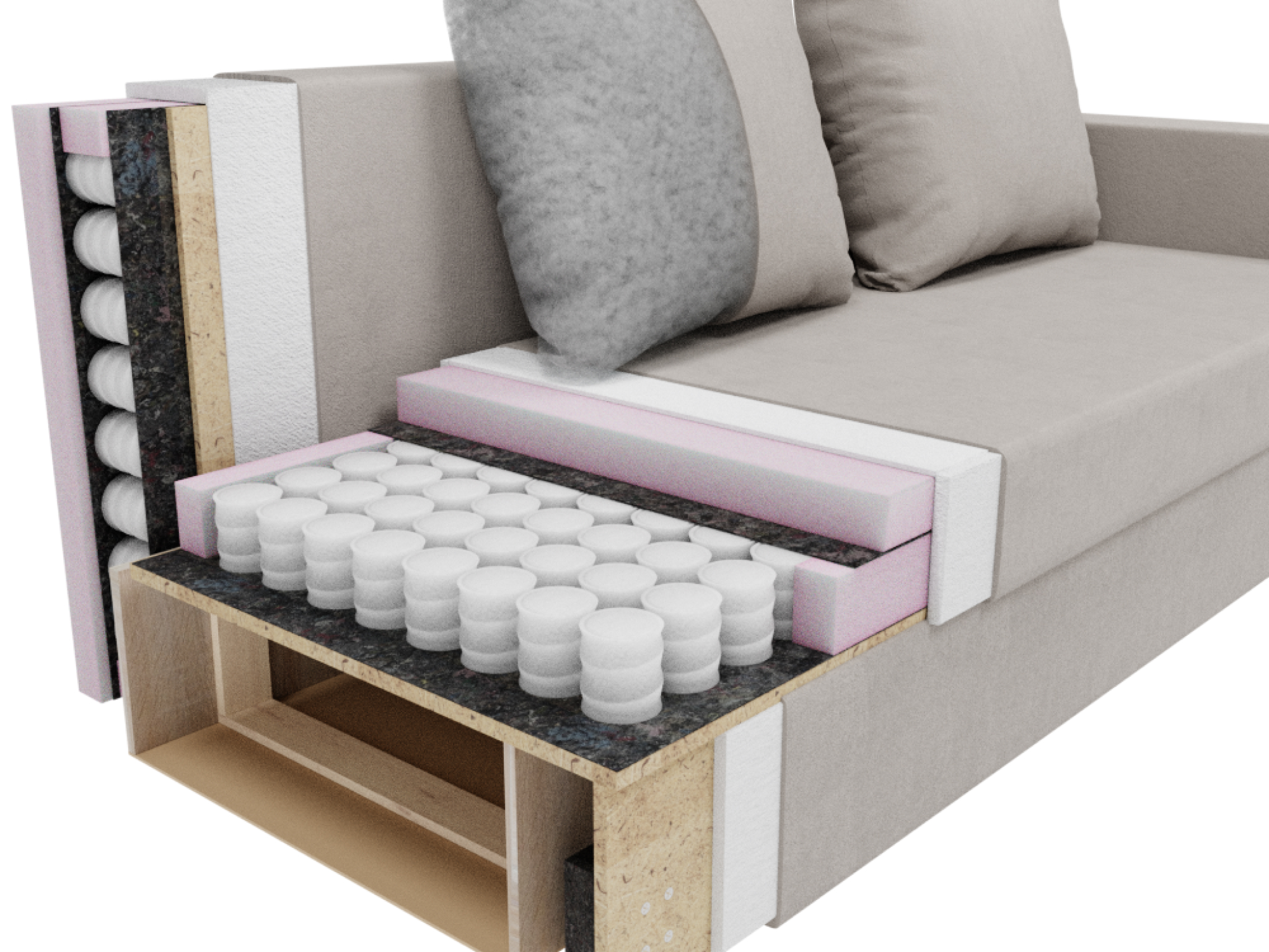 Наполнитель - пенополиуретан, который обеспечивает мягкость и комфорт при сидении. Каркас выполнен из ДВП, ЛДСП и массива дерева, что гарантирует прочность и долговечность изделия.
