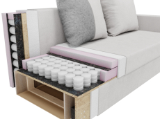Материал каркаса дивана-кровати изготовлен из ДВП, ЛДСП и массива дерева, что обеспечивает прочность и долговечность. Наполнитель выполнен из пенополиуретана, что делает диван мягким и удобным для сидения.