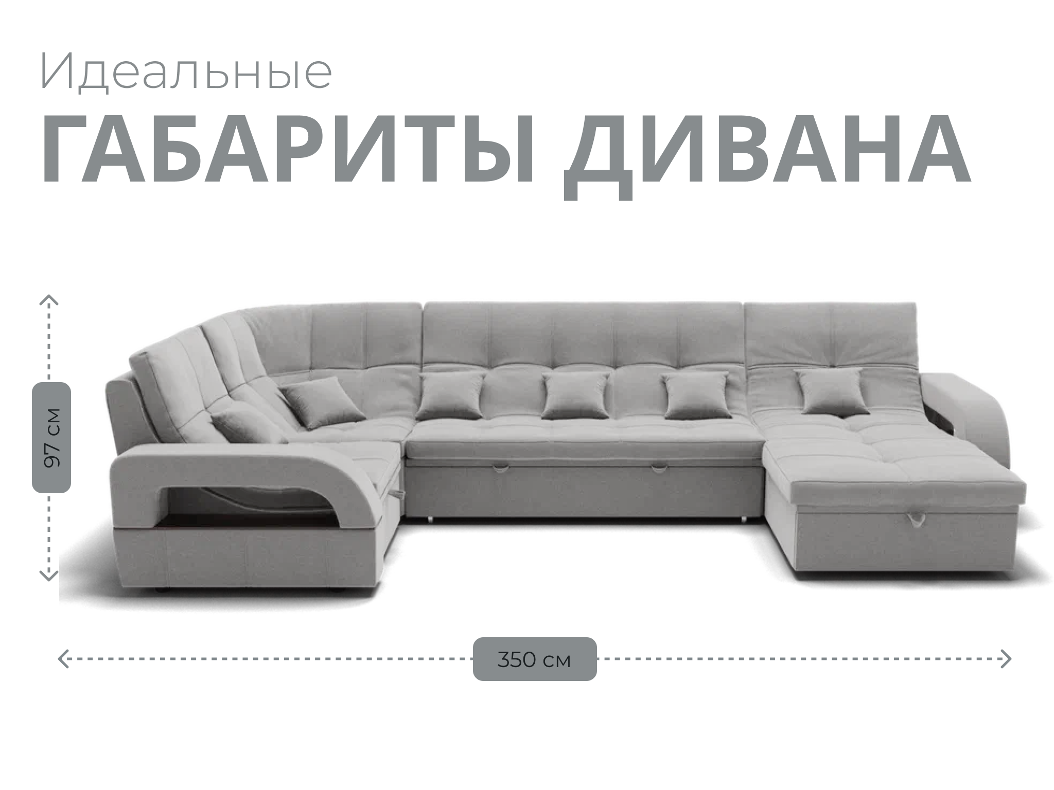Он имеет высоту 97 см, ширину 350 см и глубину 187 см. Обит велюром - Veluta lux. Диван обладает универсальным расположением угла, что позволяет его использовать в любом помещении.