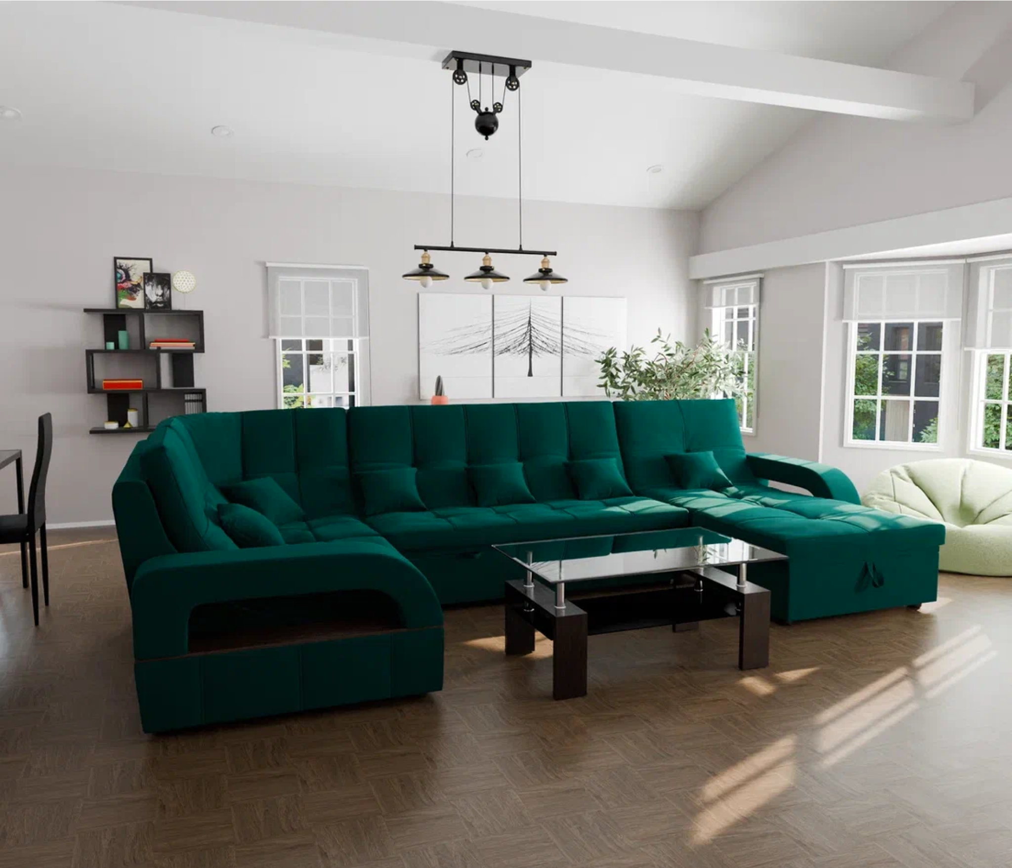 Он имеет высоту 97 см, ширину 350 см и глубину 187 см. Обит велюром - Veluta lux. Диван обладает универсальным расположением угла, что позволяет его использовать в любом помещении.