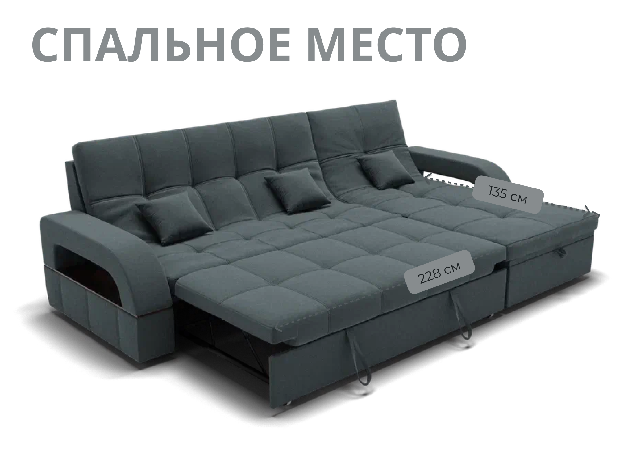 Спальное место имеет ширину 135 см и длину 228 см. Он предназначен для двух человек и имеет глубину сиденья 65 см. Максимальная нагрузка на диван составляет 280 кг.