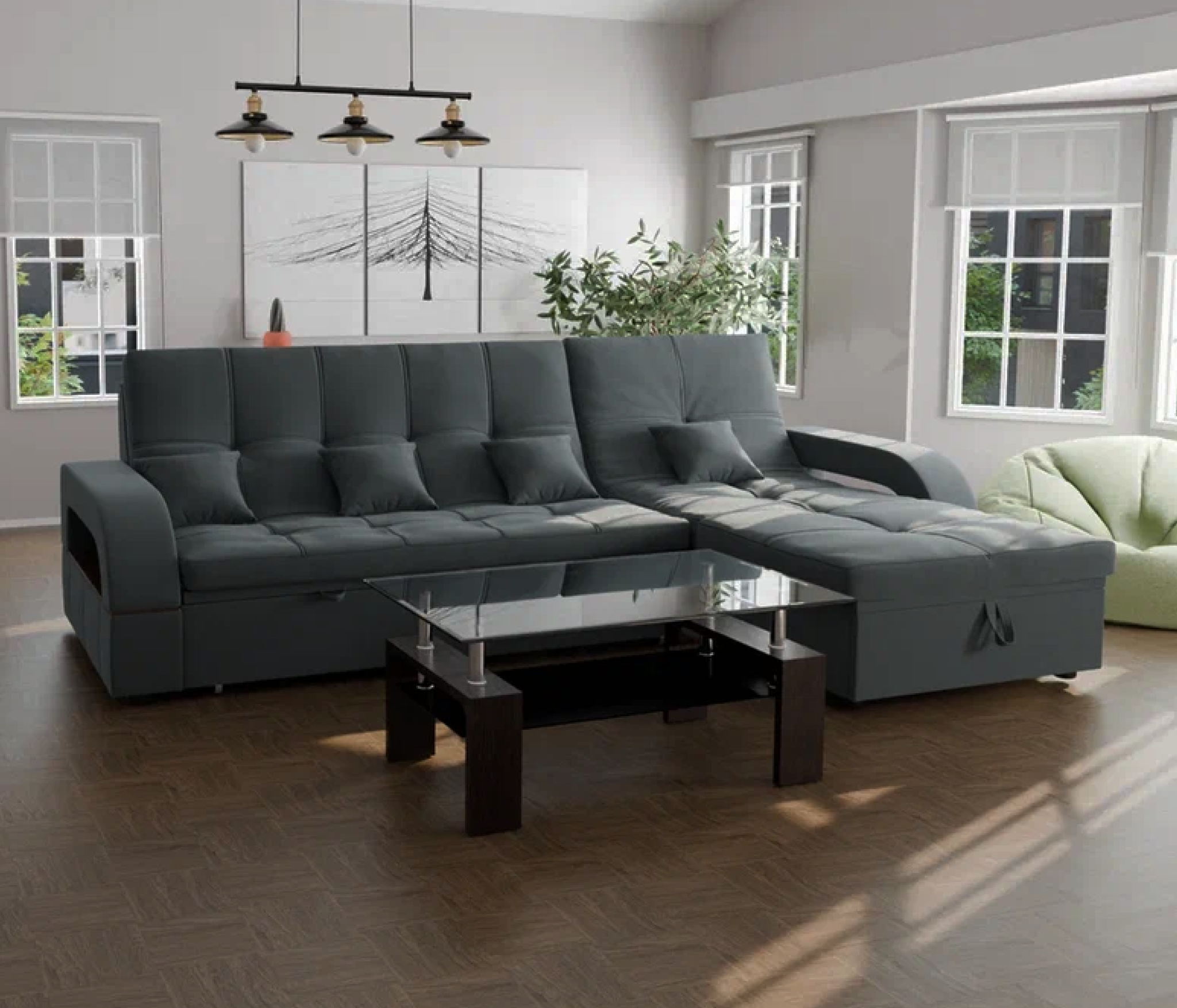Он имеет высоту 97 см, ширину 268 см и глубину 175 см. Диван обладает универсальным расположением угла, что позволяет его использовать в любом помещении.