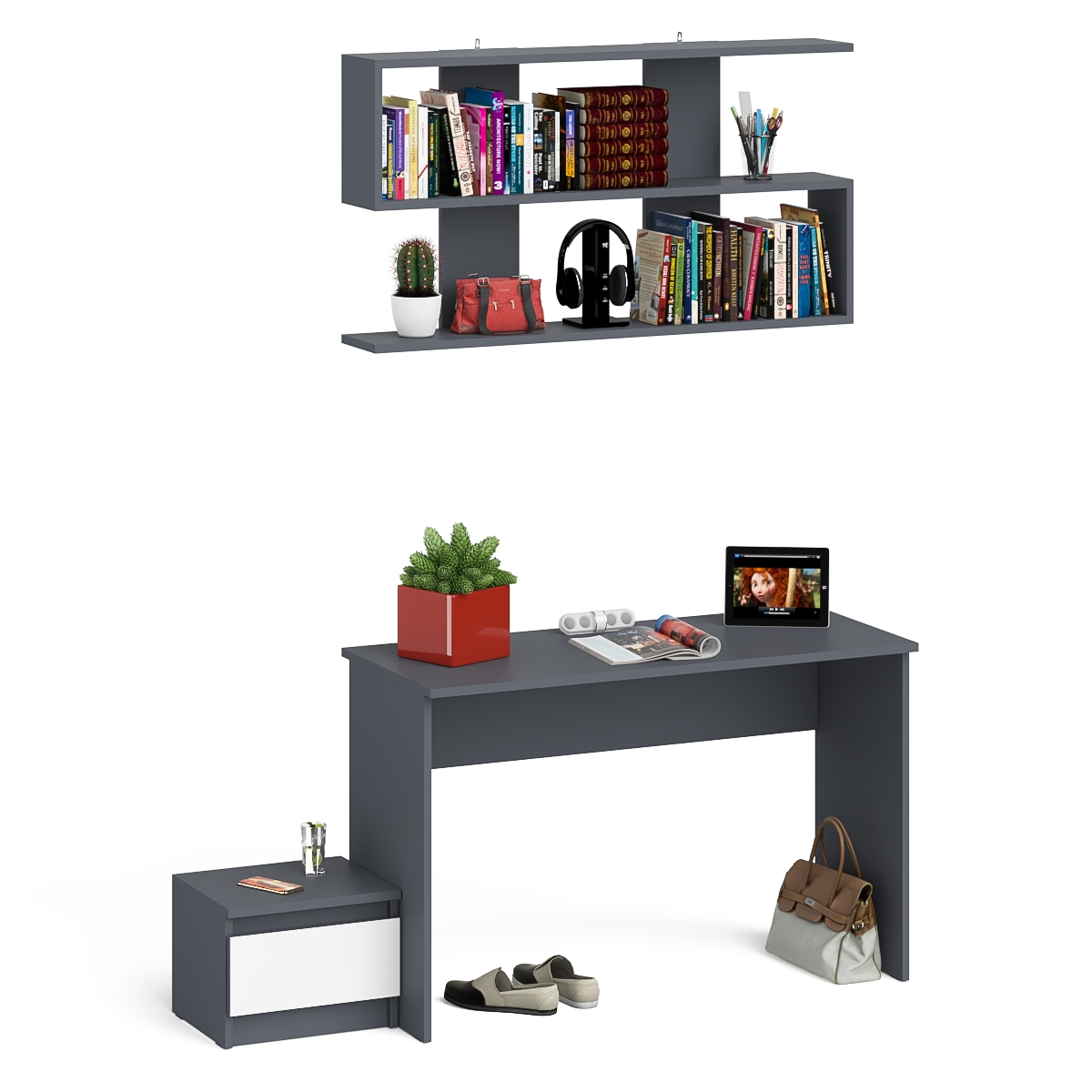 Отзывы о Столплит Стол письменный Мори 1200 с тумбочкой и навесной полкой 1200 Графит/Белый