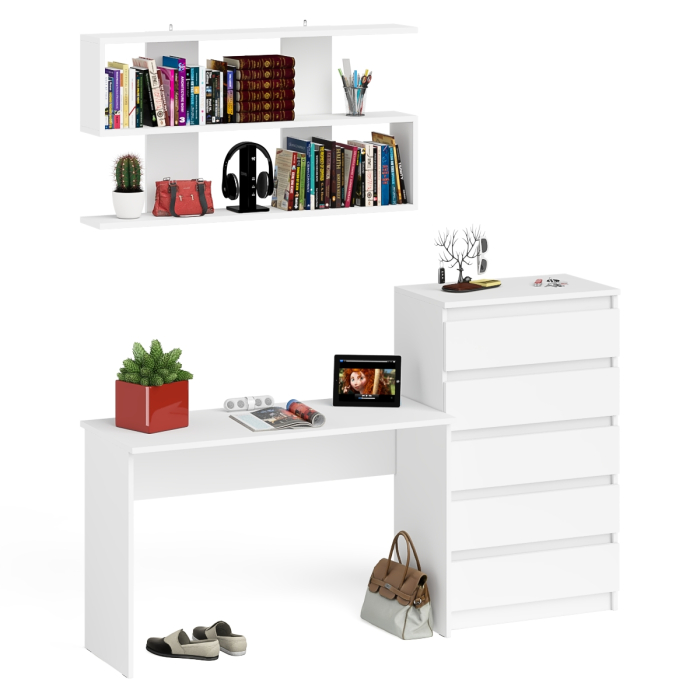 Комод высокий Мори пять выдвижных ящиков со столом для работы на 1200 и навесной полкой 1200 - минималистичный дизайн и доступная цена позволяет наслаждаться качественной и современной мебелью без значительных финансовых затрат!