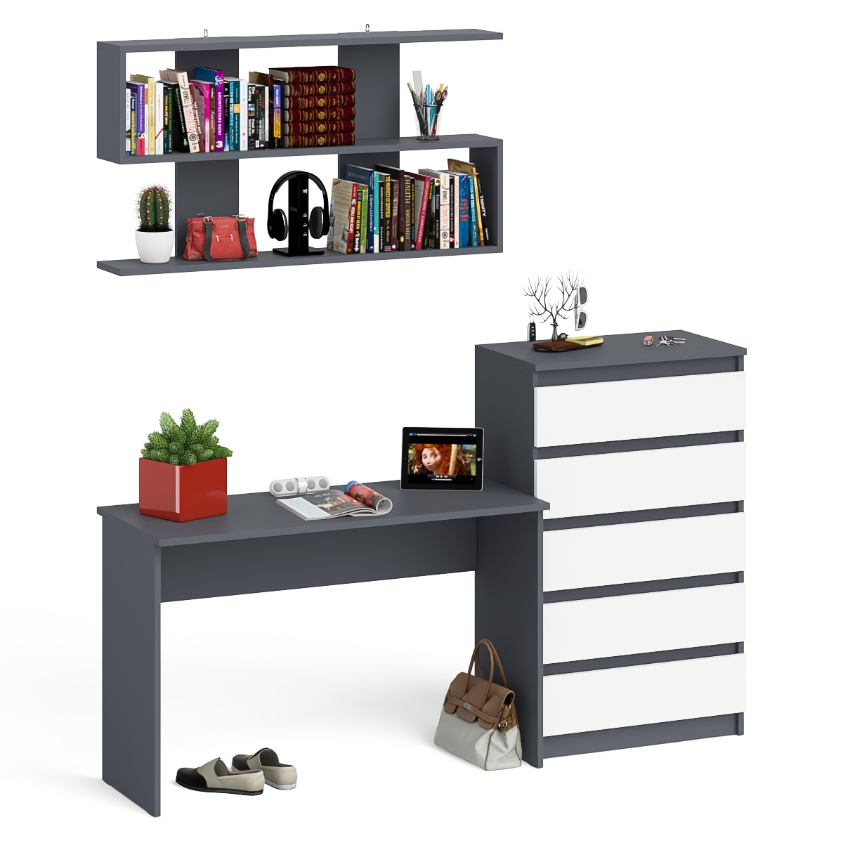Отзывы о Столплит Комод высокий Мори пять выдвижных ящиков со столом для работы на 1200 и навесной полкой 1200 Графит/Белый