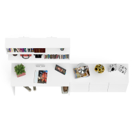 Комод-тумба оборудована по центру тремя выдвижными ящиками и двумя закрытыми отделениями с полками по бокам. Открывание ящиков и дверей производится за счет пространства между планками и фасадами. Выдвижные ящики на роликовых направляющих L=350 мм. неполного выдвижения обеспечивают комфортную эксплуатацию.