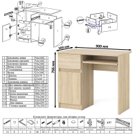 стола компьютерного - 90х50х76,6 см. Особенности: ящик слева, выдвижная полка для клавиатуры.