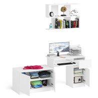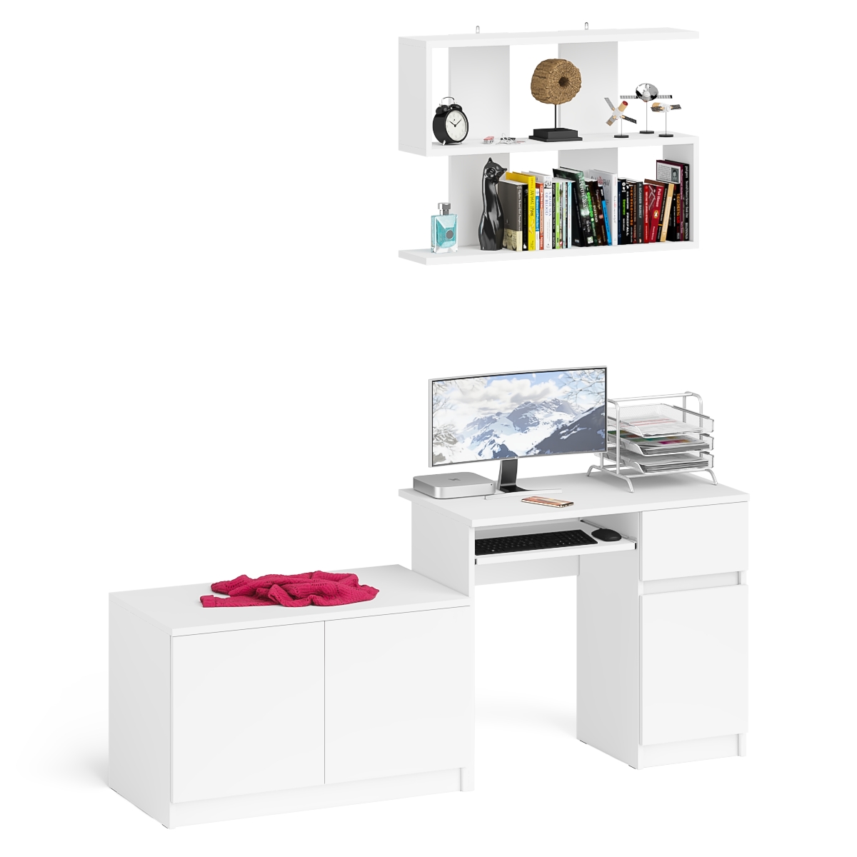 Комплектация включает стол Мори МС-1 правый компьютерный, тумбу Мори МА900.1 и навесную полку Плк-900. Отсутствие ручек главное преимущество данной модели. Роль ручек выполняют сами фасады.