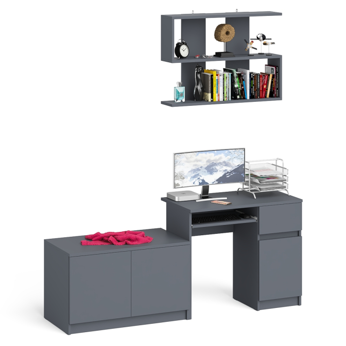 Комплектация включает стол Мори МС-1 правый компьютерный, тумбу Мори МА900.1 и навесную полку Плк-900. Отсутствие ручек главное преимущество данной модели. Роль ручек выполняют сами фасады.