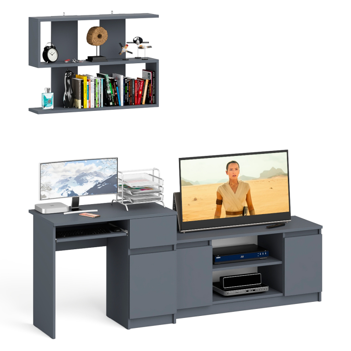 Комплектация включает стол Мори МС-1 правый компьютерный, тумбу ТВ Мори МТВ1200.1 и навесную полку Плк-900. Отсутствие ручек главное преимущество данной модели. Роль ручек выполняют сами фасады.