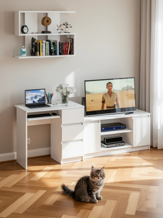 Комплектация включает стол компьютерный три ящика Мори МС-6 правый, тумбу ТВ Мори МТВ1200.1 и навесную полку Плк-900. Отсутствие ручек главное преимущество данной модели. Роль ручек выполняют сами фасады.