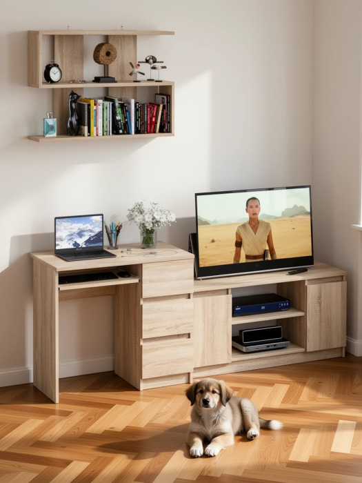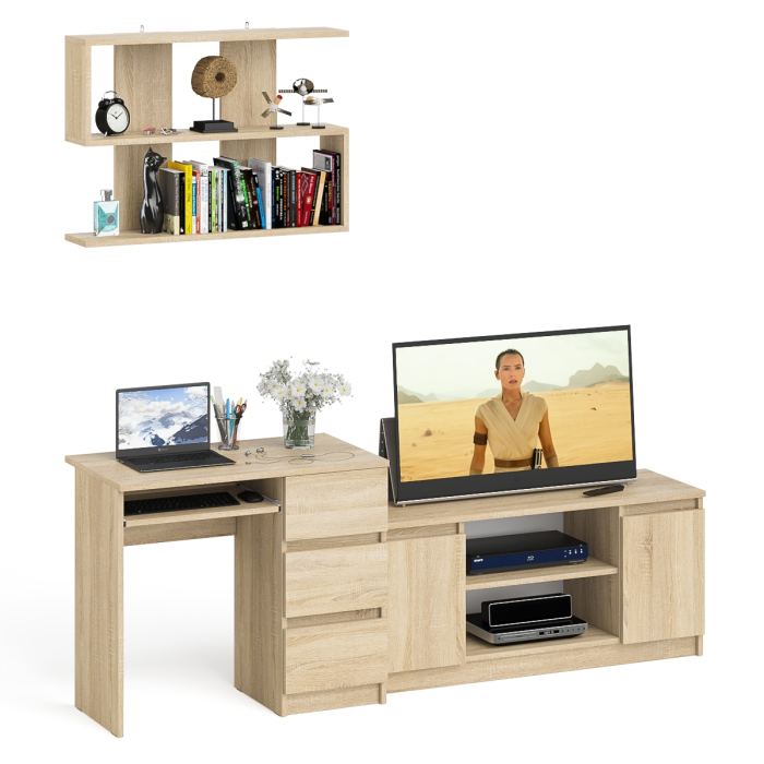 Комплектация включает стол компьютерный три ящика Мори МС-6 правый, тумбу ТВ Мори МТВ1200.1 и навесную полку Плк-900. Отсутствие ручек главное преимущество данной модели. Роль ручек выполняют сами фасады.