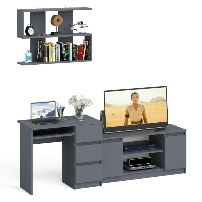 Комплектация включает стол компьютерный три ящика Мори МС-6 правый, тумбу ТВ Мори МТВ1200.1 и навесную полку Плк-900. Отсутствие ручек главное преимущество данной модели. Роль ручек выполняют сами фасады.