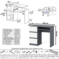 На нижних кромках опор предусмотрены пластиковые подпятники для защиты поверхности пола от механических повреждений. Поставляется в разобранном виде в надёжной упаковке, с комплектом сборочной фурнитуры и инструкцией по сборке.