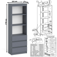 Стеллаж Мори МСТ600.3 с двумя открытыми полками сверху и тремя выдвижными ящиками снизу. Открывание ящиков производится за счет пространства между планками и фасадами. Выдвижные ящики на роликовых направляющих L=300 мм. неполного выдвижения обеспечивают длительную и тихую эксплуатацию.