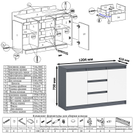 Комод-тумба оборудована по центру тремя выдвижными ящиками и двумя закрытыми отделениями с полками по бокам. Открывание ящиков и дверей производится за счет пространства между планками и фасадами. Выдвижные ящики на роликовых направляющих L=350 мм. неполного выдвижения обеспечивают комфортную эксплуатацию.