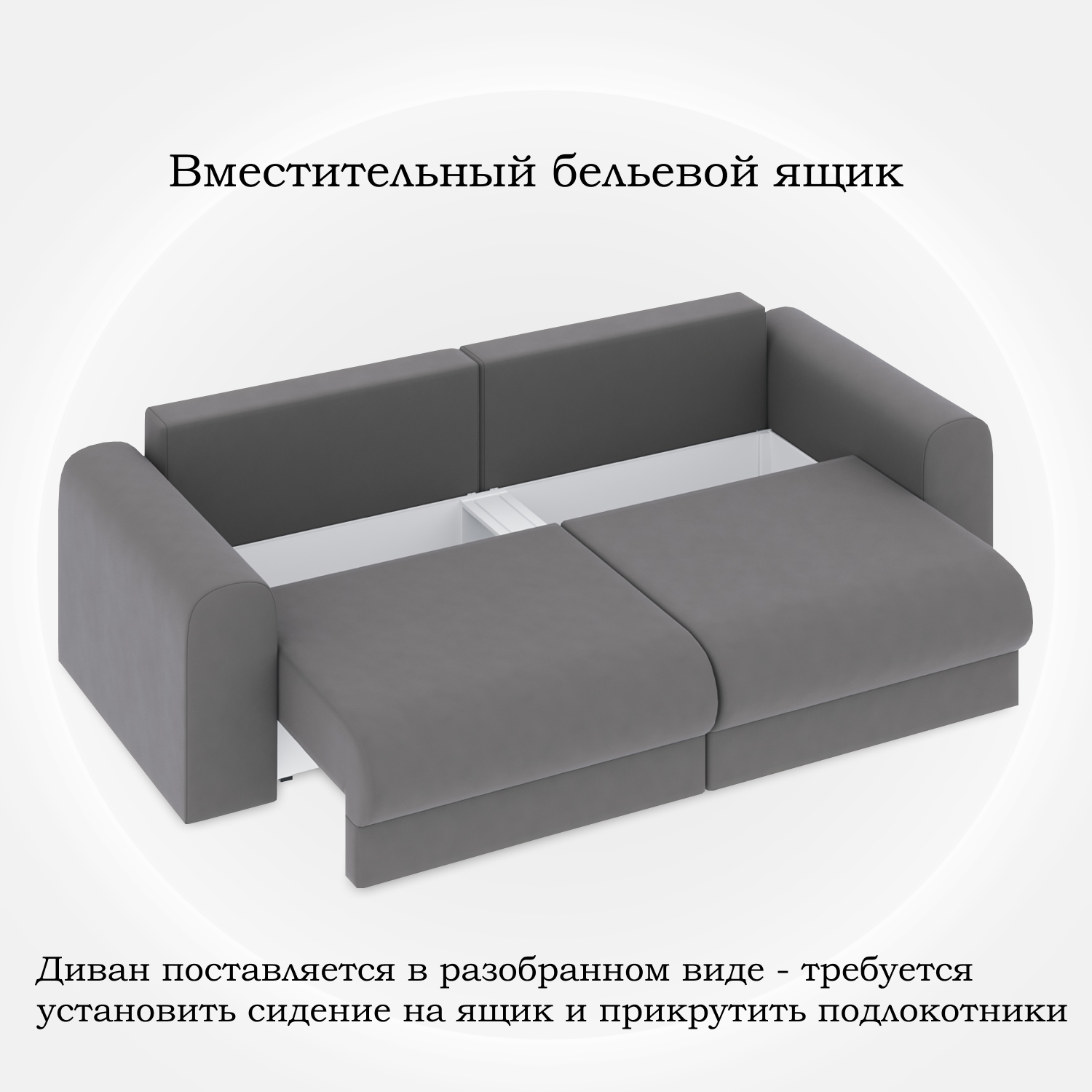 Диван поставляется в разобранном виде - требуется установить сидение на ящик и прикрутить подлокотники.