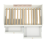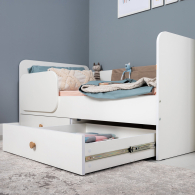 Кровать Джастин 11.55 со спальным местом 800х1600 мм предназначена для малышей. Ортопедическое основание - гнутоклеенные ламели - в комплекте. В основании кроватки расположены два выдвижных ящика на шариковых направляющих, обеспечивающих место для хранения постельного белья и игрушек. На спинку кровати крепится накладка-карман из серо-бежевой ткани Maxima Velutto 07. Накладка для кроватей Джастин включает 4 кармана. Крепится накладка-карман с помощью П-профиля, который позволяет легко и удобно снимать её для стирки. На нижних кромках опор кровати предусмотрены пластиковые подпятники для защиты поверхности пола от механических повреждений.