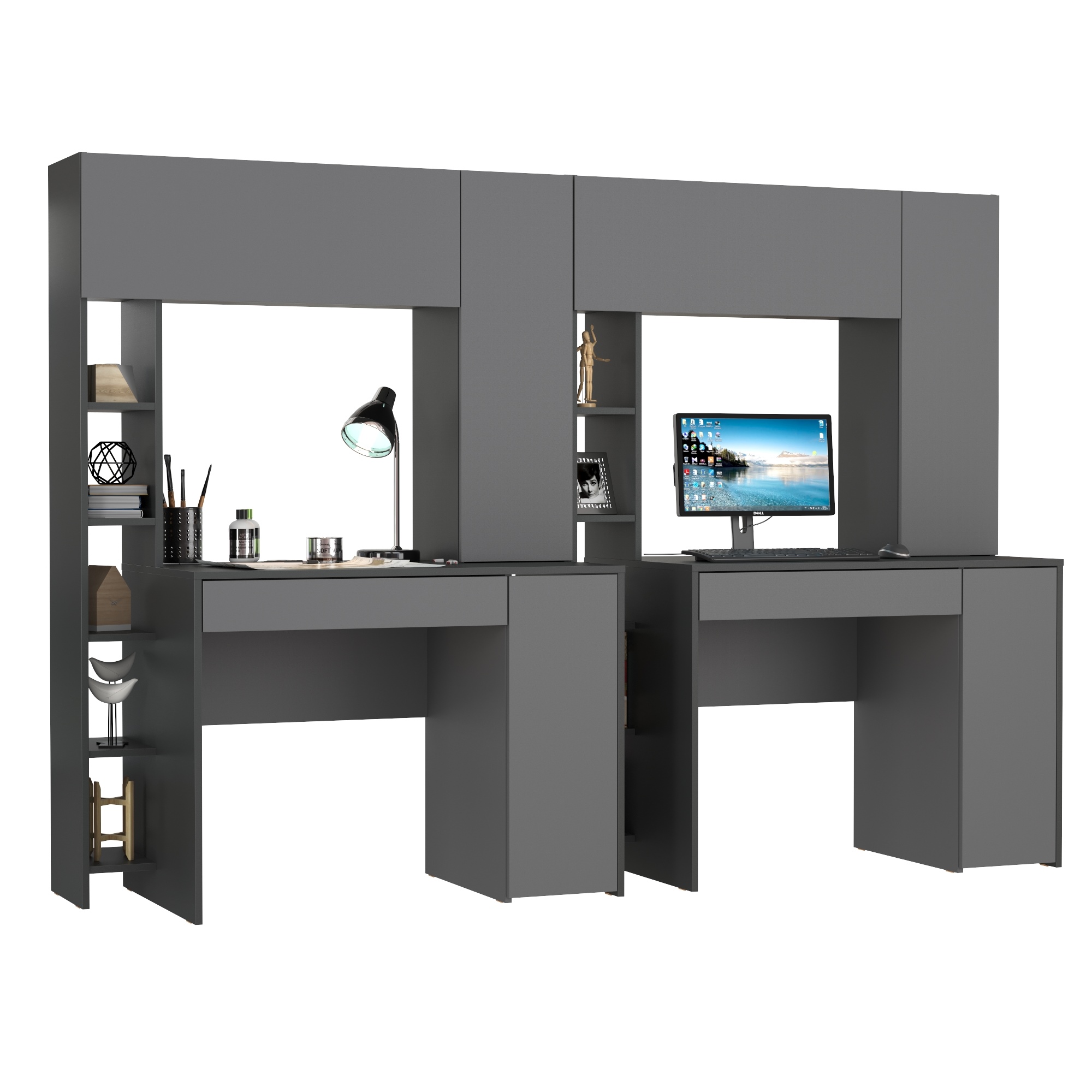 В комплектации два стола Комфорт 12.71. Удобные и устойчивые столы с тумбами под системные блоки и выдвижными ящиками для канцелярии дополнены практичными надстройками. Надстройки с вместительными нишами за откидными фасадами и распашными отделениями с полками выделяют на столах удобные ниши для мониторов. По центру задней стороны столешниц расположен кабель-канал, который позволяет аккуратно и незаметно провести провода, поддерживая порядок на рабочих местах. Закрытые отделения компьютерных столов Комфорт 12.71 хранят деловые тайны, а пять полок стеллажей - документы и книги в удобной близости. Тумбы расположены с правой стороны компьютерных столов, стеллажи - с левой, универсальная сборка не предусмотрена. Ящики на шариковых направляющих полного выдвижения обеспечивают надёжное и прямолинейное перемещение. Подъемный фасад и ящик стола Комфорт 12.71 открываются за край фасада. Распашные фасады надстройки и тумбы открываются нажатием. Распашные двери мебели на четырёхшарнирных петлях без доводчиков, откидные фасады - на газовых лифтах. Дно ящиков и задние стенки врезные, выполненные из облагороженного ХДФ, позволяющего ящикам выдерживать большую нагрузку.