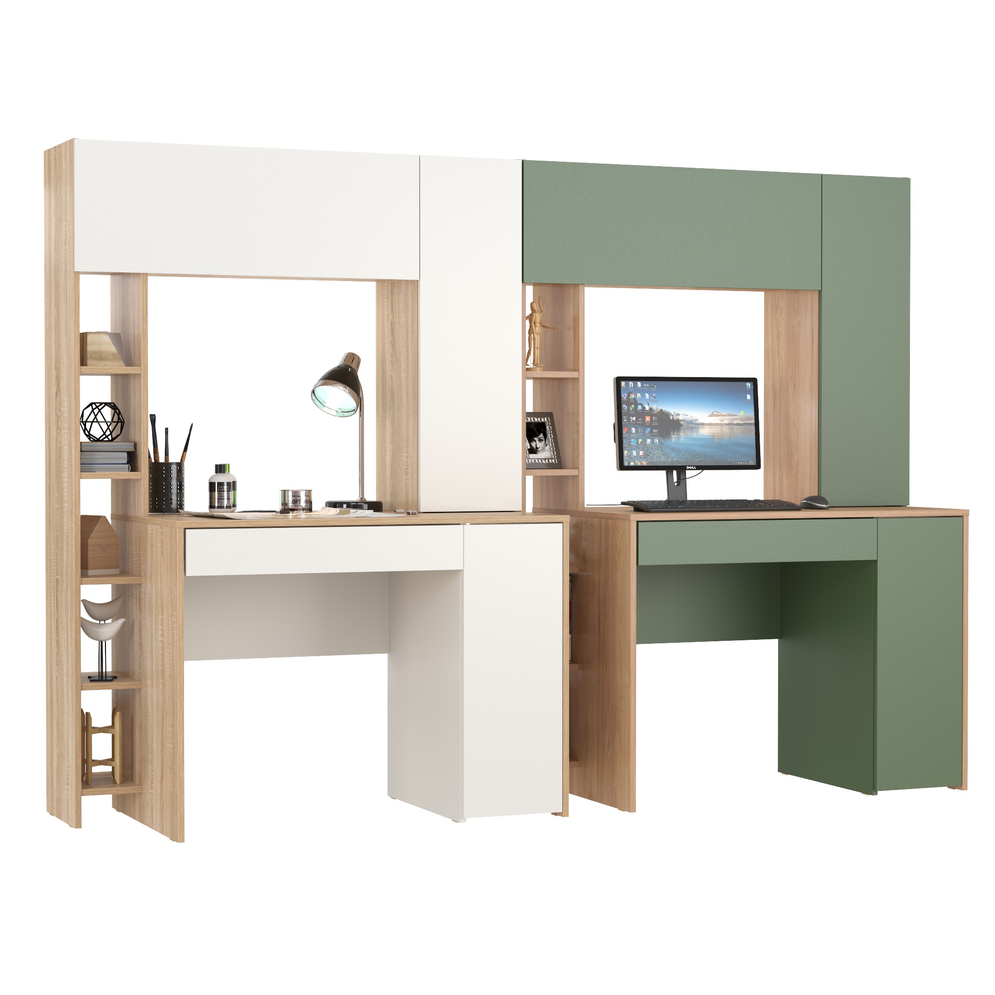 В комплектации два стола Комфорт 12.71. Удобные и устойчивые столы с тумбами под системные блоки и выдвижными ящиками для канцелярии дополнены практичными надстройками. Надстройки с вместительными нишами за откидными фасадами и распашными отделениями с полками выделяют на столах удобные ниши для мониторов. По центру задней стороны столешниц расположен кабель-канал, который позволяет аккуратно и незаметно провести провода, поддерживая порядок на рабочих местах. Закрытые отделения компьютерных столов Комфорт 12.71 хранят деловые тайны, а пять полок стеллажей - документы и книги в удобной близости. Тумбы расположены с правой стороны компьютерных столов, стеллажи - с левой, универсальная сборка не предусмотрена. Ящики на шариковых направляющих полного выдвижения обеспечивают надёжное и прямолинейное перемещение. Подъемный фасад и ящик стола Комфорт 12.71 открываются за край фасада. Распашные фасады надстройки и тумбы открываются нажатием. Распашные двери мебели на четырёхшарнирных петлях без доводчиков, откидные фасады - на газовых лифтах. Дно ящиков и задние стенки врезные, выполненные из облагороженного ХДФ, позволяющего ящикам выдерживать большую нагрузку.
