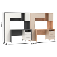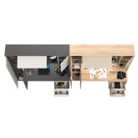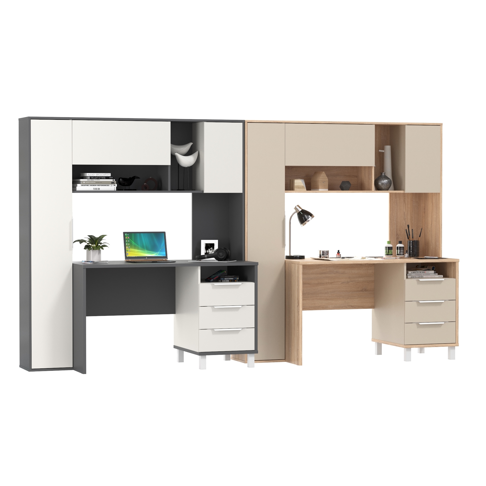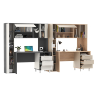 Столы не имеют универсальной сборки - тумбы расположены с правой стороны, а с левой стороны находятся пеналы с глухими распашными дверками и пятью полками внутри.