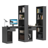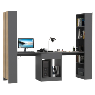 Эти столы идеально подходят для совместной работы или учебы, предлагая достаточно места для каждого пользователя. Столы оснащены вместительными столешницами, позволяющими разместить все необходимое оборудование, включая компьютер, монитор и канцелярские принадлежности. С одной стороны столешница каждого стола закреплена на тумбе, с другой - на полочке открытого стеллажа. Стеллажи, интегрированные в конструкции, добавляют дополнительные возможности для хранения книг, документов и личных вещей, обеспечивая порядок и легкий доступ к необходимым предметам. Тумбы столов имеют выдвижной ящик и открытую нишу для системного блока стационарного компьютера. Если же, у Вас в пользовании ноутбук, ниши пригодятся для размещения портфеля, сумочки или рюкзака. Стеллажи в данной конструкции значительно увеличивает комфорт рабочего места. На восьми полочках стеллажей можно разместить все, что необходимо для результативной работы или учёбы. Папки с документами, журналы, учебники и книги, мелкая офисная техника, предметы декора или игрушки. Завершив работу, положите на полочку сложенный ноутбук и освободите столешницу для игры с ребенком или собирания пазлов. Столы универсальны при сборке - стеллажи можно расположить как с левой стороны, так и с правой.