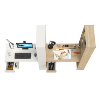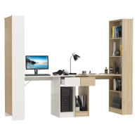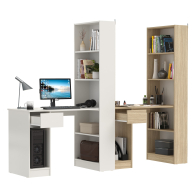 Эти столы идеально подходят для совместной работы или учебы, предлагая достаточно места для каждого пользователя. Столы оснащены вместительными столешницами, позволяющими разместить все необходимое оборудование, включая компьютер, монитор и канцелярские принадлежности. С одной стороны столешница каждого стола закреплена на тумбе, с другой - на полочке открытого стеллажа. Стеллажи, интегрированные в конструкции, добавляют дополнительные возможности для хранения книг, документов и личных вещей, обеспечивая порядок и легкий доступ к необходимым предметам. Тумбы столов имеют выдвижной ящик и открытую нишу для системного блока стационарного компьютера. Если же, у Вас в пользовании ноутбук, ниши пригодятся для размещения портфеля, сумочки или рюкзака. Стеллажи в данной конструкции значительно увеличивает комфорт рабочего места. На восьми полочках стеллажей можно разместить все, что необходимо для результативной работы или учёбы. Папки с документами, журналы, учебники и книги, мелкая офисная техника, предметы декора или игрушки. Завершив работу, положите на полочку сложенный ноутбук и освободите столешницу для игры с ребенком или собирания пазлов. Столы универсальны при сборке - стеллажи можно расположить как с левой стороны, так и с правой.