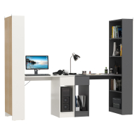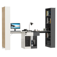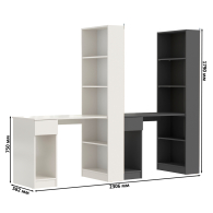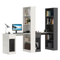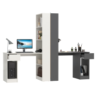Эти столы идеально подходят для совместной работы или учебы, предлагая достаточно места для каждого пользователя. Столы оснащены вместительными столешницами, позволяющими разместить все необходимое оборудование, включая компьютер, монитор и канцелярские принадлежности. С одной стороны столешница каждого стола закреплена на тумбе, с другой - на полочке открытого стеллажа. Стеллажи, интегрированные в конструкции, добавляют дополнительные возможности для хранения книг, документов и личных вещей, обеспечивая порядок и легкий доступ к необходимым предметам. Тумбы столов имеют выдвижной ящик и открытую нишу для системного блока стационарного компьютера. Если же, у Вас в пользовании ноутбук, ниши пригодятся для размещения портфеля, сумочки или рюкзака. Стеллажи в данной конструкции значительно увеличивает комфорт рабочего места. На восьми полочках стеллажей можно разместить все, что необходимо для результативной работы или учёбы. Папки с документами, журналы, учебники и книги, мелкая офисная техника, предметы декора или игрушки. Завершив работу, положите на полочку сложенный ноутбук и освободите столешницу для игры с ребенком или собирания пазлов. Столы универсальны при сборке - стеллажи можно расположить как с левой стороны, так и с правой.