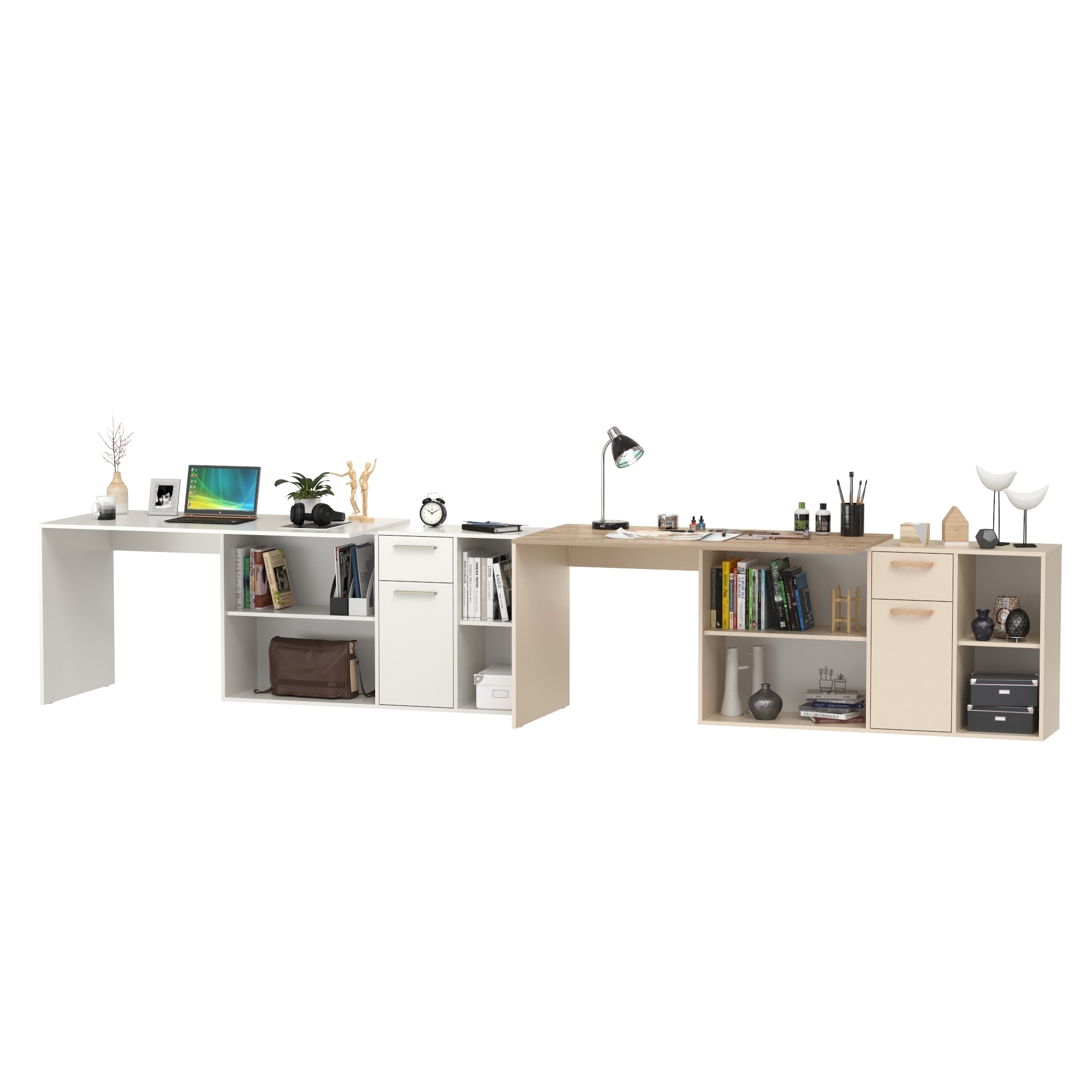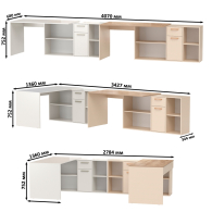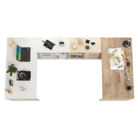 Оба стола могут быть собраны как в прямом, так и в угловом варианте, что позволяет гибко организовать рабочее пространство, максимально адаптируя его под нужды пользователей. Большие, широкие столешницы, толщиной 22 мм, с одной стороны установлены на опоры, а с другой – на вместительные тумбы, каждая из которых располагает боковыми открытыми нишами и центральным отделением с закрытой дверцей и выдвижным ящиком. Вариативность сборки – это важное преимущество данной модели. Столы могут быть размещены как по прямой, образуя большое рабочее пространство шириной 407 см, так и под углом с размером 342,7х136 см.