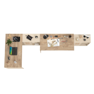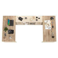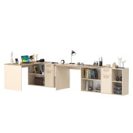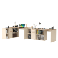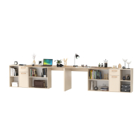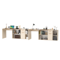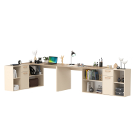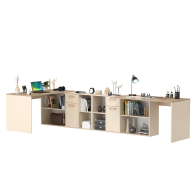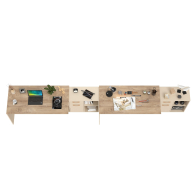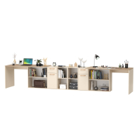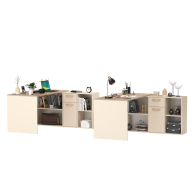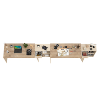 Оба стола могут быть собраны как в прямом, так и в угловом варианте, что позволяет гибко организовать рабочее пространство, максимально адаптируя его под нужды пользователей. Большие, широкие столешницы, толщиной 22 мм, с одной стороны установлены на опоры, а с другой – на вместительные тумбы, каждая из которых располагает боковыми открытыми нишами и центральным отделением с закрытой дверцей и выдвижным ящиком. Вариативность сборки – это важное преимущество данной модели. Столы могут быть размещены как по прямой, образуя большое рабочее пространство шириной 407 см, так и под углом с размером 342,7х136 см.